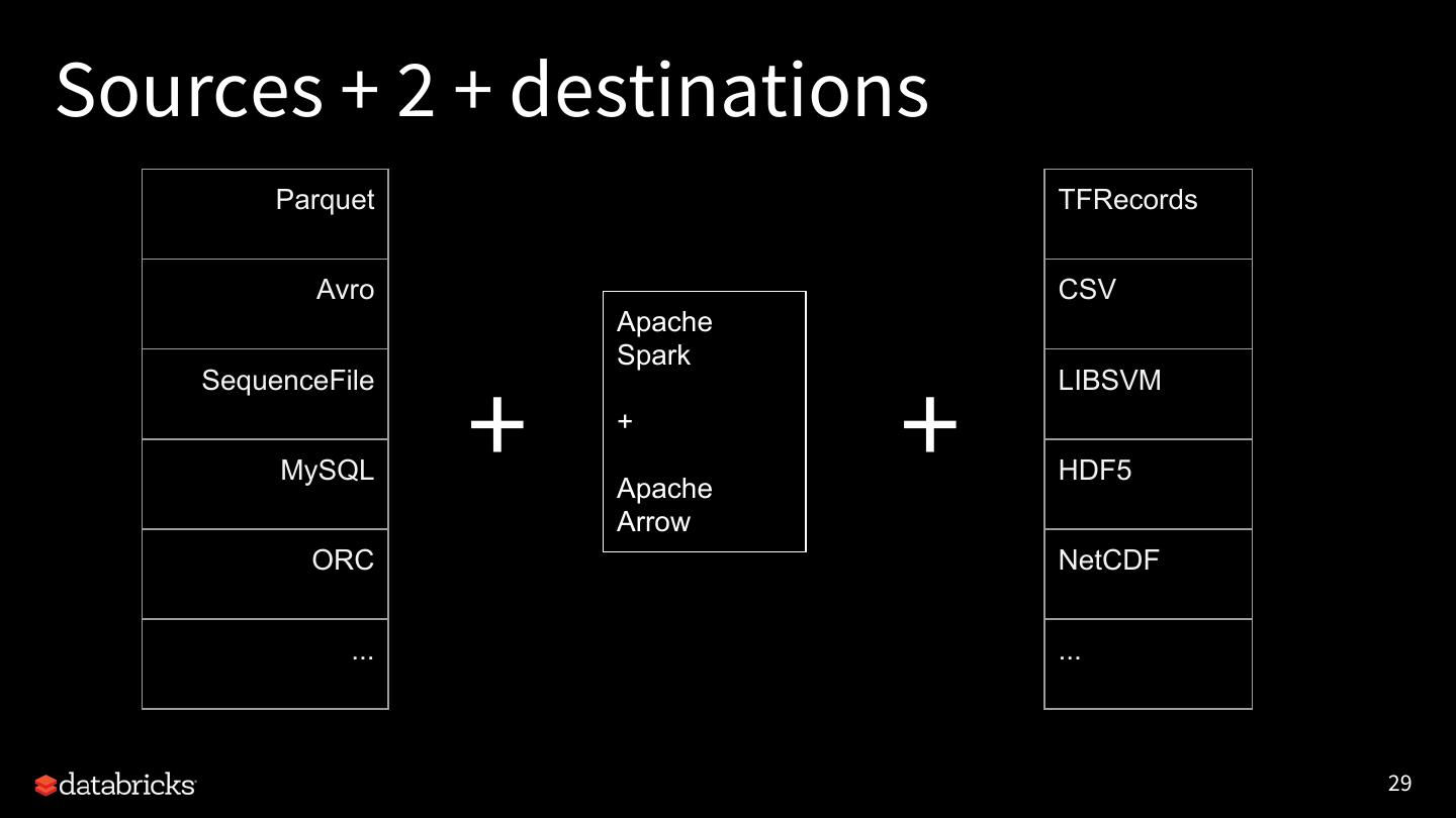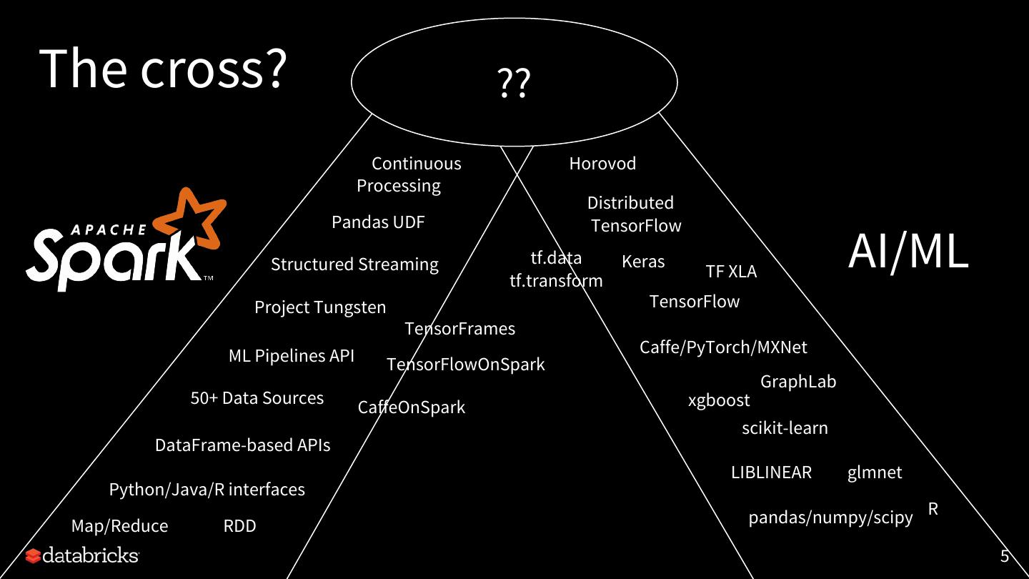 7 .The cross? ?? Continuous Horovod Processing Distributed Pandas UDF TensorFlow Structured Streaming tf.data tf.transform Keras TF XLA AI/ML Project Tungsten TensorFlow TensorFrames ML Pipelines API Caffe/PyTorch/MXNet TensorFlowOnSpark GraphLab 50+ Data Sources xgboost CaffeOnSpark scikit-learn DataFrame-based APIs LIBLINEAR glmnet Python/Java/R interfaces Map/Reduce RDD pandas/numpy/scipy R 5