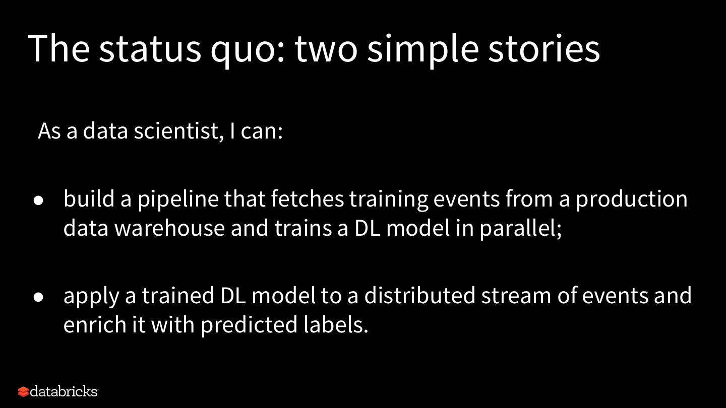13 .The status quo: two simple stories As a data scientist, I can: ● build a pipeline that fetches training events from a production data warehouse and trains a DL model in parallel; ● apply a trained DL model to a distributed stream of events and enrich it with predicted labels.
