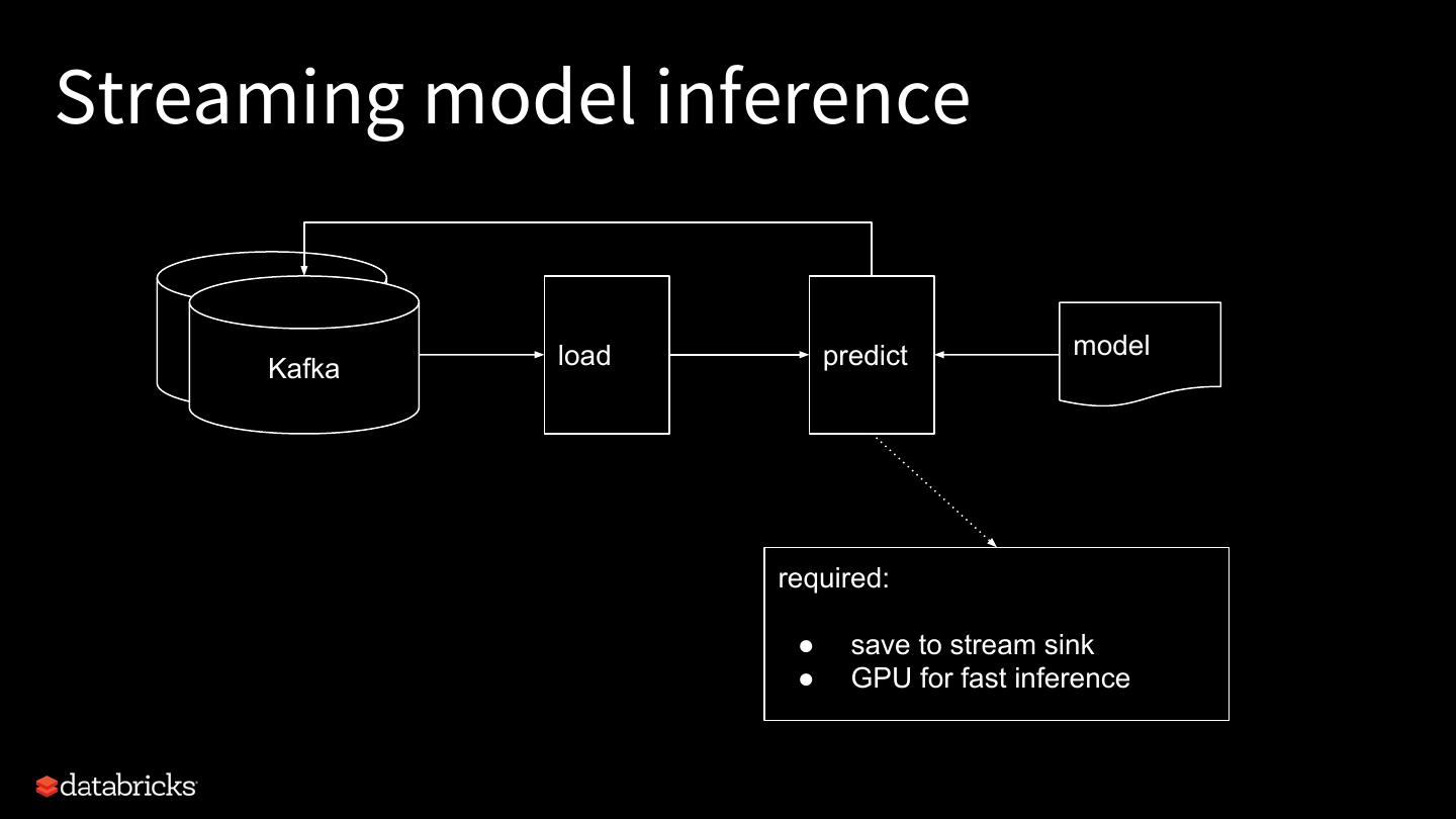 16 .Streaming model inference load predict model Kafka required: ● save to stream sink ● GPU for fast inference