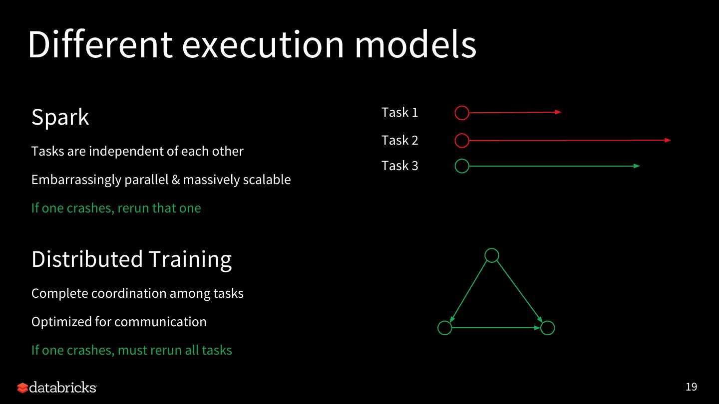 20 .Different execution models Spark Task 1 Task 2 Tasks are independent of each other Task 3 Embarrassingly parallel & massively scalable If one crashes… Distributed Training Complete coordination among tasks Optimized for communication 18