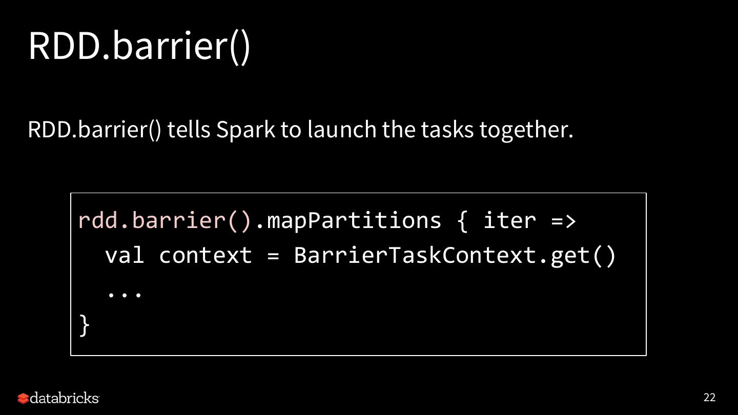 24 .RDD.barrier() RDD.barrier() tells Spark to launch the tasks together. rdd.barrier().mapPartitions { iter => val context = BarrierTaskContext.get() ... } 22