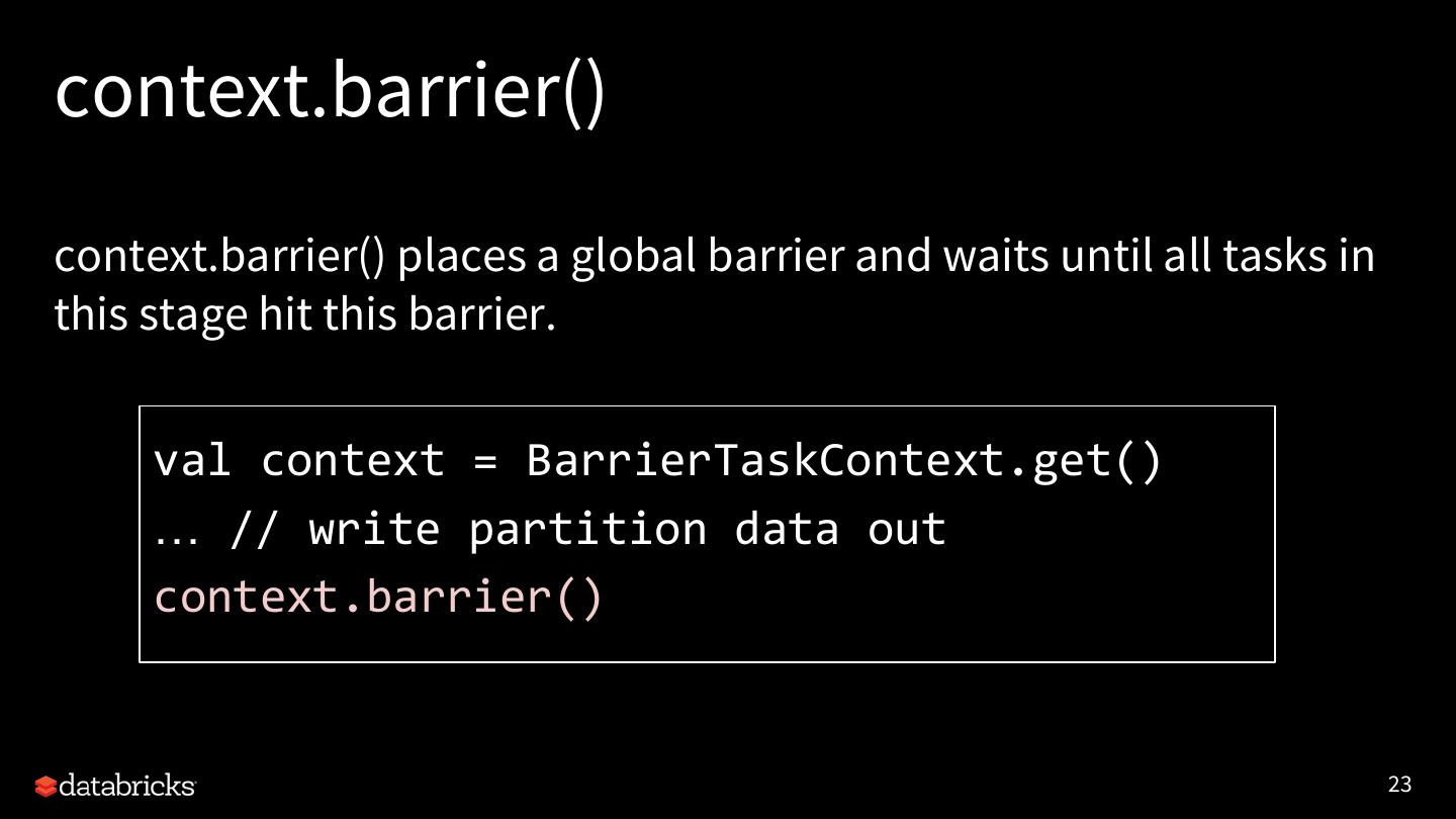 25 .context.barrier() context.barrier() places a global barrier and waits until all tasks in this stage hit this barrier. val context = BarrierTaskContext.get() … // write partition data out context.barrier() 23