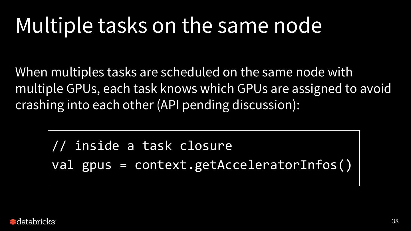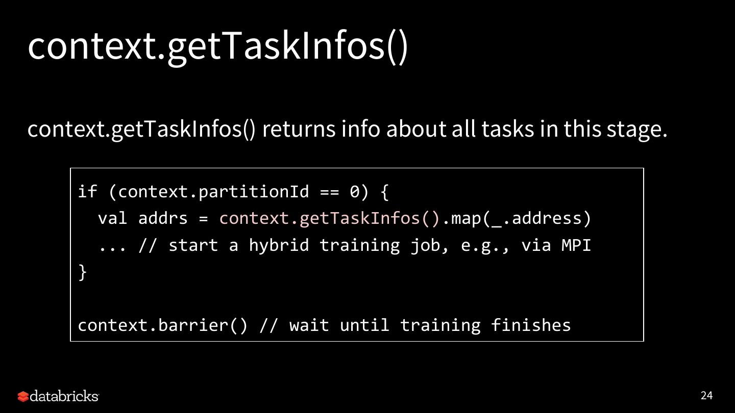 26 .context.getTaskInfos() context.getTaskInfos() returns info about all tasks in this stage. if (context.partitionId == 0) { val addrs = context.getTaskInfos().map(_.address) ... // start a hybrid training job, e.g., via MPI } context.barrier() // wait until training finishes 24