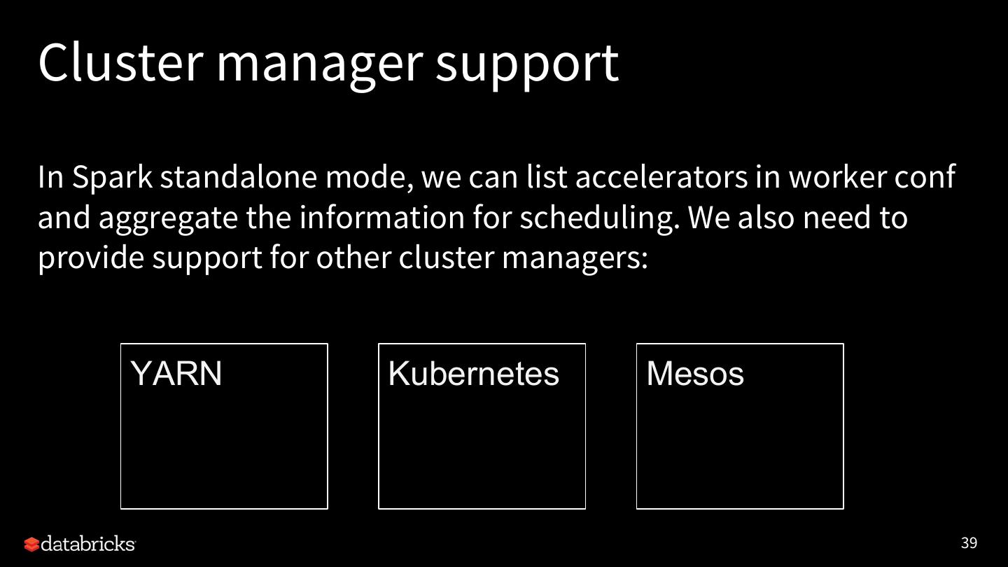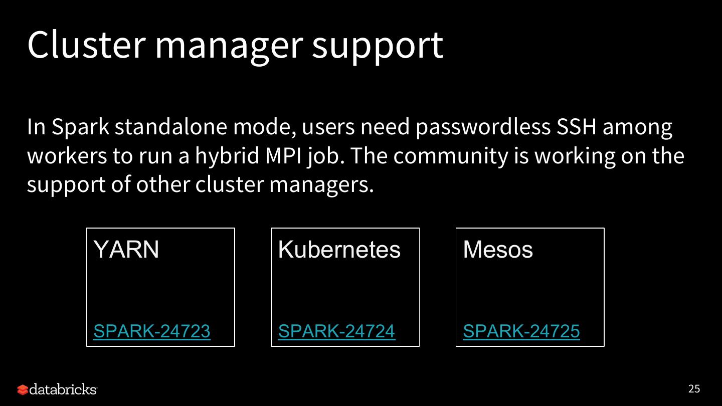 27 .Cluster manager support In Spark standalone mode, users need passwordless SSH among workers to run a hybrid MPI job. The community is working on the support of other cluster managers. YARN Kubernetes Mesos SPARK-24723 SPARK-24724 SPARK-24725 25