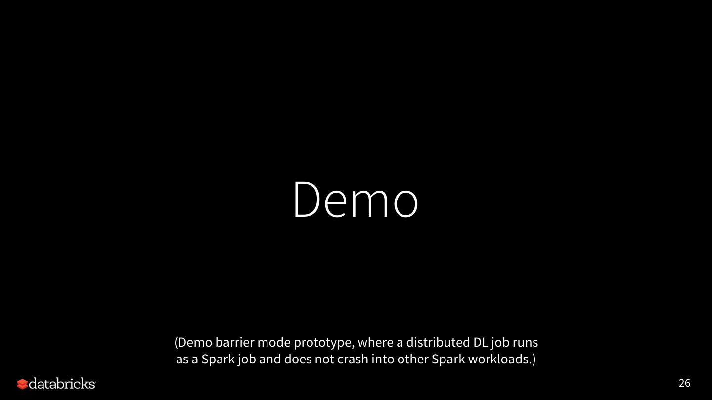28 . Demo (Demo barrier mode prototype, where a distributed DL job runs as a Spark job and does not crash into other Spark workloads.) 26