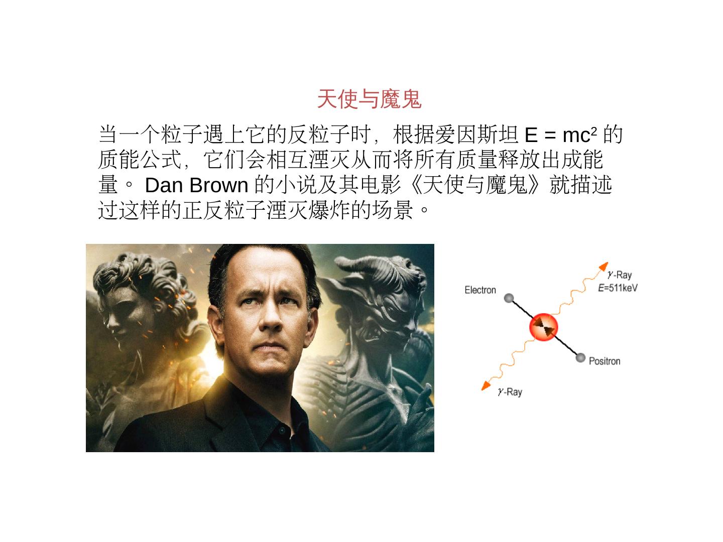 6 .天使与魔鬼 当一个粒子遇上它的反粒子时,根据爱因斯坦 E = mc 2 的质能公式,它们会相互湮灭从而将所有质量释放出成能量。 Dan Brown 的小说及其电影 《 天使与魔鬼 》 就描述过这样的正反粒子湮灭爆炸的场景。