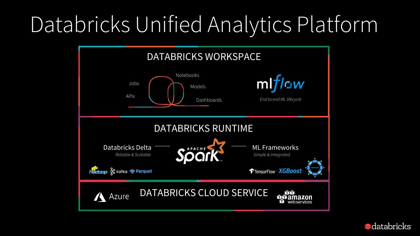 5 .Databricks Unified Analytics Platform DATABRICKS WORKSPACE Notebooks Jobs Models APIs Dashboards End to end ML lifecycle DATABRICKS RUNTIME Databricks Delta ML Frameworks Reliable & Scalable Simple & Integrated DATABRICKS CLOUD SERVICE