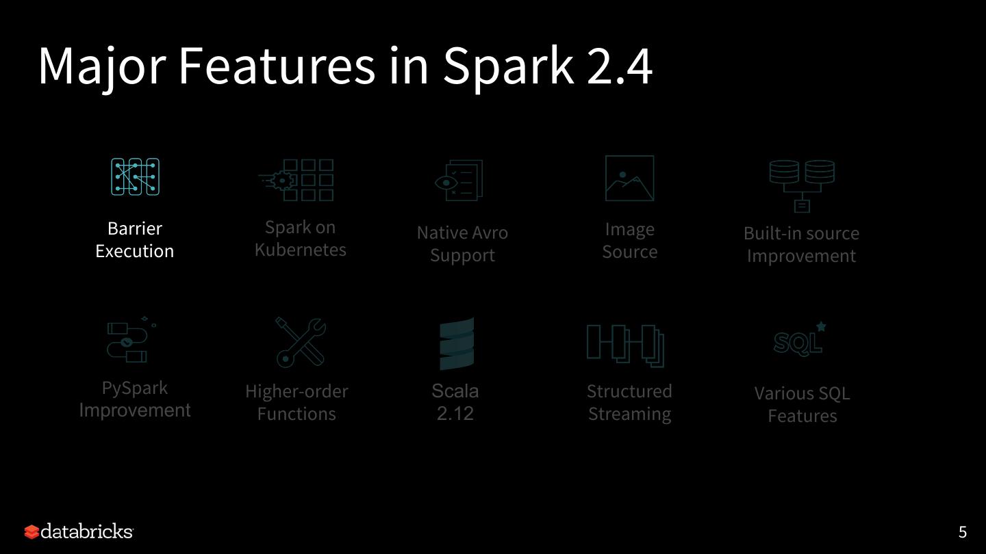 6 .Major Features in Spark 2.4 Barrier Spark on Scala PySpark Structured Execution Kubernetes 2.12 Improvement Streaming Image Native Avro Built-in source Higher-order Various SQL Source Support Improvement Functions Features 4
