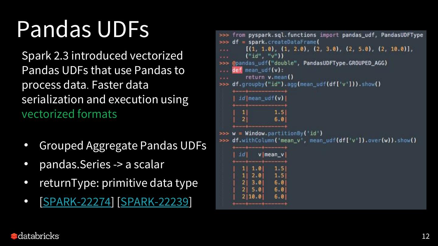 14 .Pandas UDFs Spark 2.3 introduced vectorized Pandas UDFs that use Pandas to process data. Faster data serialization and execution using vectorized formats • Grouped Aggregate Pandas UDFs • pandas.Series -> a scalar • returnType: primitive data type • [SPARK-22274] [SPARK-22239] 12