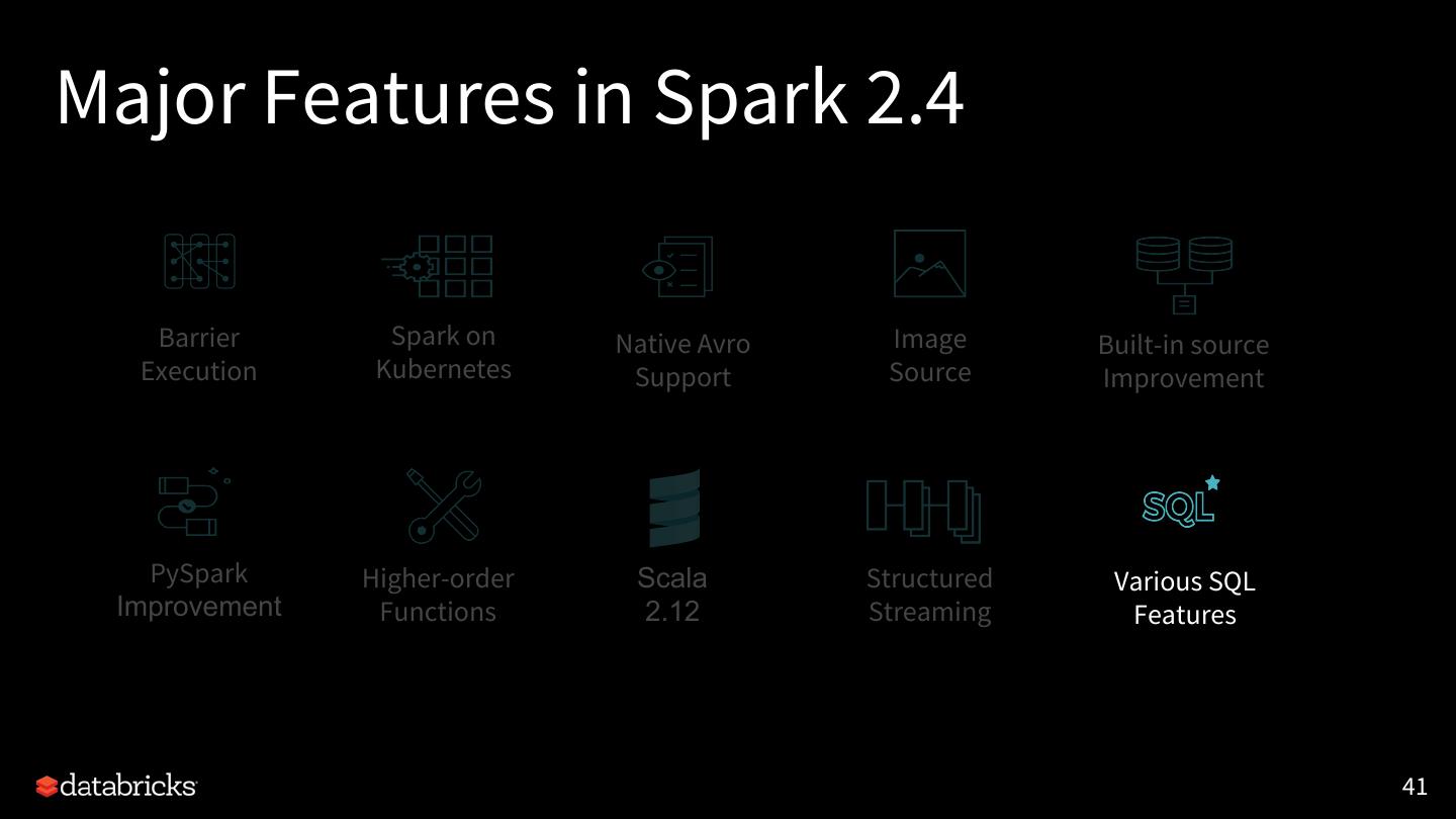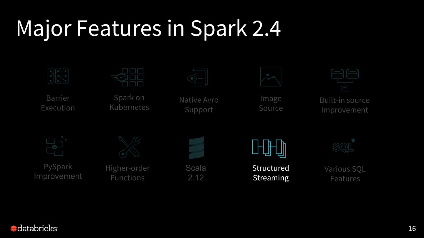 7 .Major Features in Spark 2.4 Barrier Spark on Native Avro Image Built-in source Execution Kubernetes Support Source Improvement PySpark Higher-order Scala Structured Various SQL Improvement Functions 2.12 Streaming Features 5