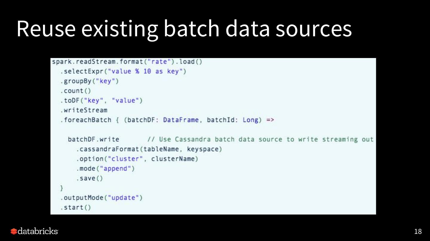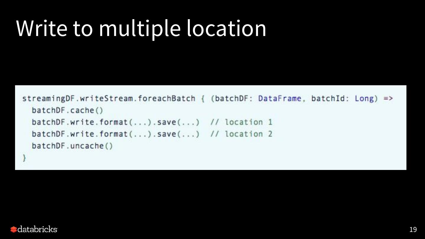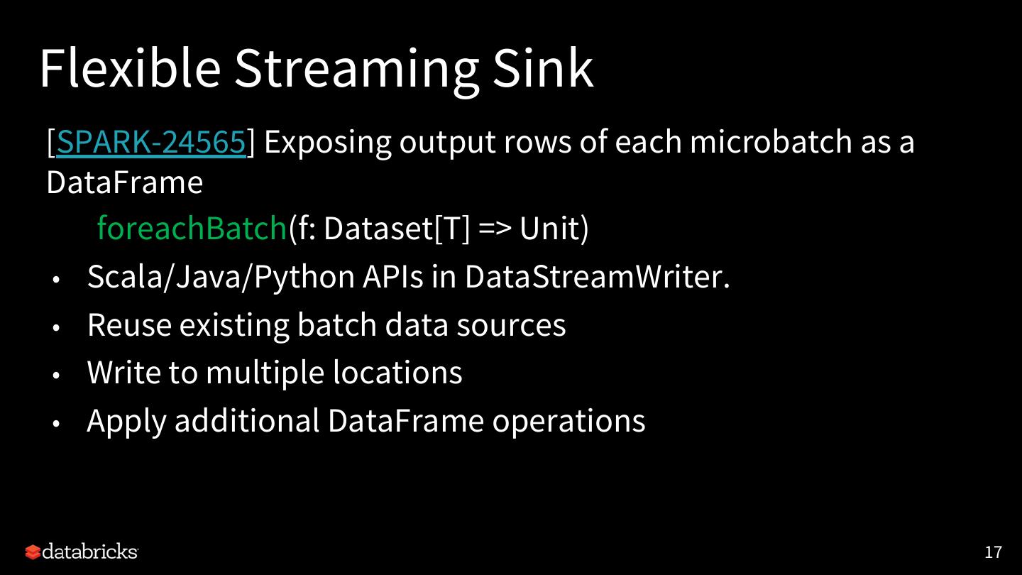 19 .Flexible Streaming Sink [SPARK-24565] Exposing output rows of each microbatch as a DataFrame foreachBatch(f: Dataset[T] => Unit) • Scala/Java/Python APIs in DataStreamWriter. • Reuse existing batch data sources • Write to multiple locations • Apply additional DataFrame operations 17