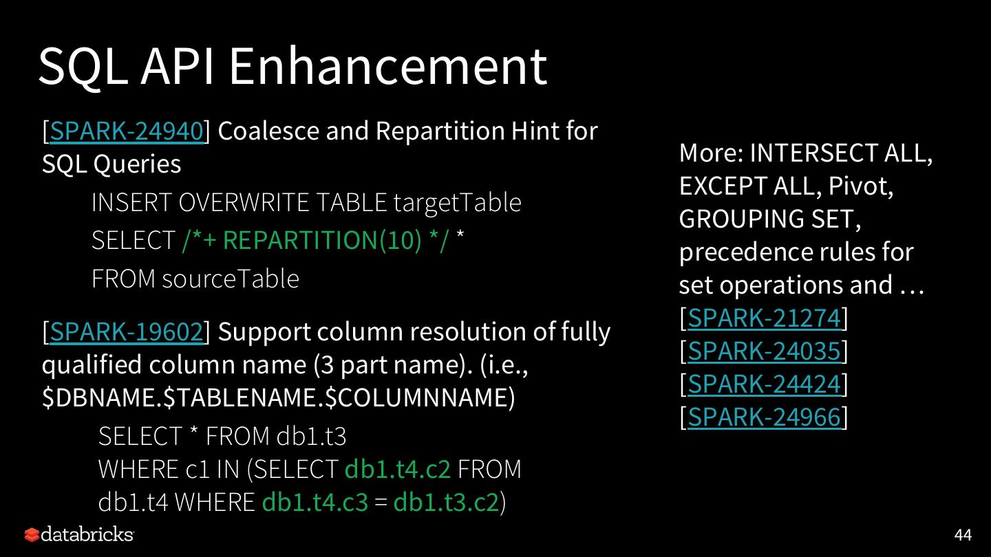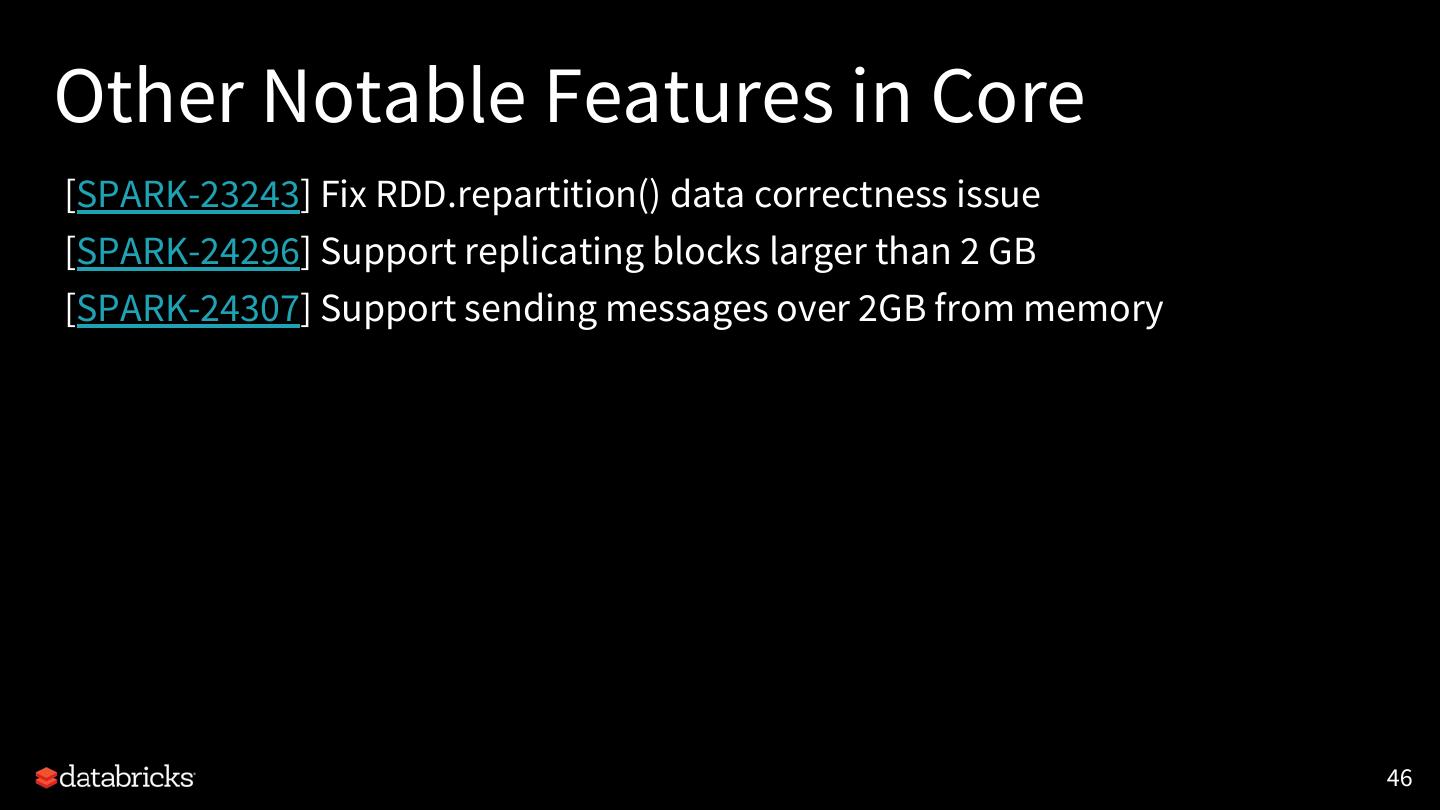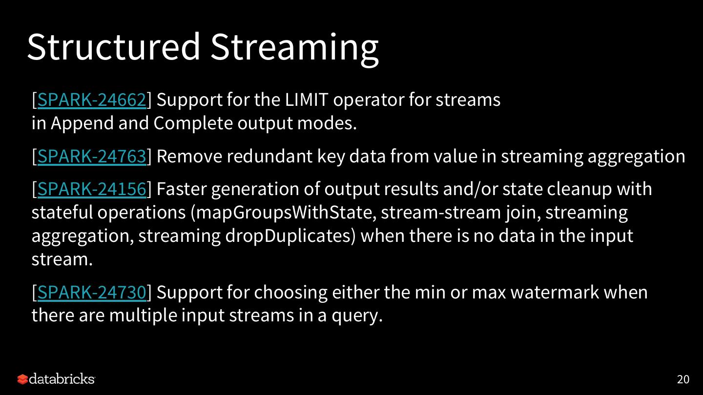 22 .Structured Streaming [SPARK-24662] Support for the LIMIT operator for streams in Append and Complete output modes. [SPARK-24763] Remove redundant key data from value in streaming aggregation [SPARK-24156] Faster generation of output results and/or state cleanup with stateful operations (mapGroupsWithState, stream-stream join, streaming aggregation, streaming dropDuplicates) when there is no data in the input stream. [SPARK-24730] Support for choosing either the min or max watermark when there are multiple input streams in a query. 20
