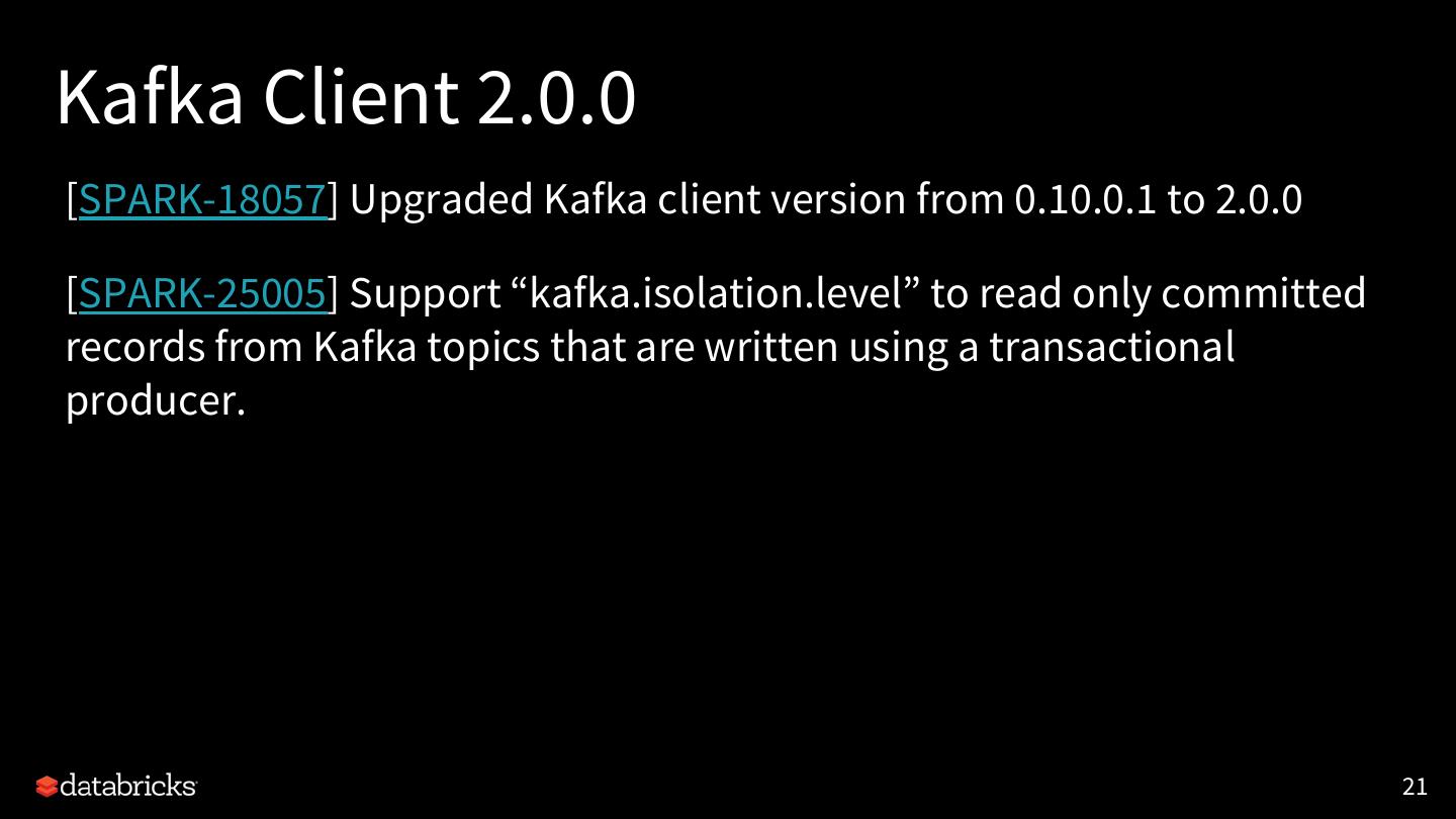 23 .Kafka Client 2.0.0 [SPARK-18057] Upgraded Kafka client version from 0.10.0.1 to 2.0.0 [SPARK-25005] Support “kafka.isolation.level” to read only committed records from Kafka topics that are written using a transactional producer. 21