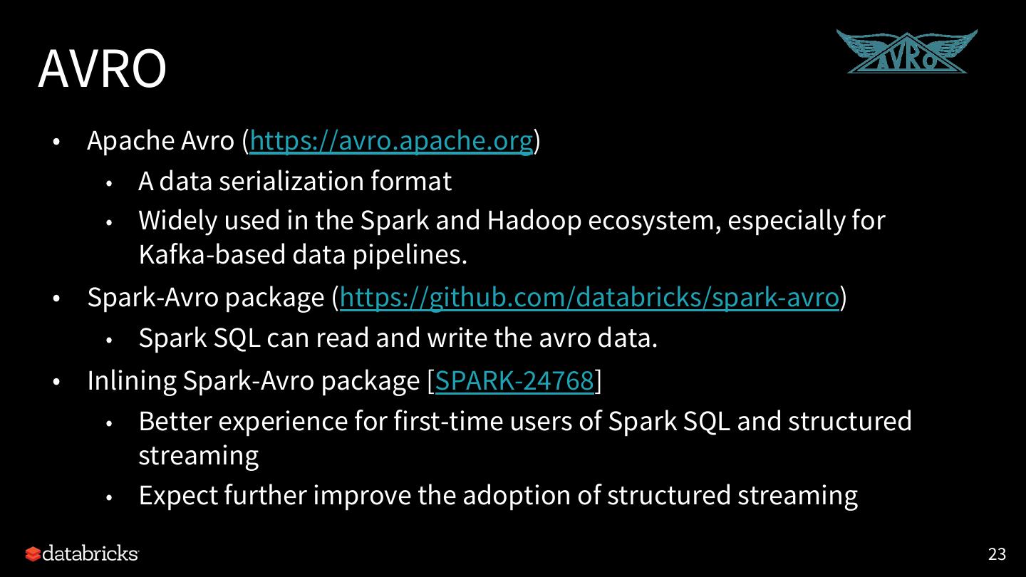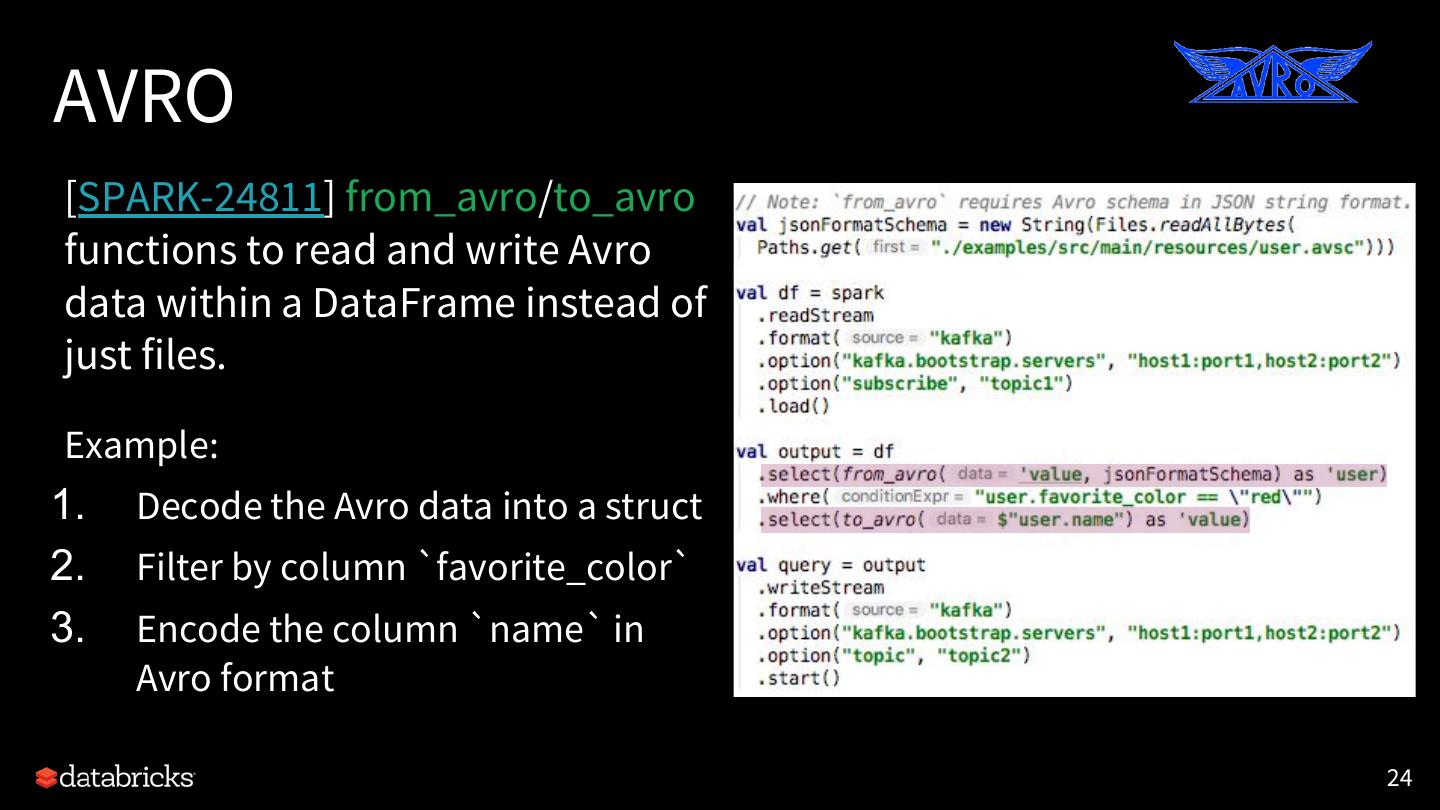 26 .AVRO [SPARK-24811] from_avro/to_avro functions to read and write Avro data within a DataFrame instead of just files. Example: 1. Decode the Avro data into a struct 2. Filter by column `favorite_color` 3. Encode the column `name` in Avro format 24