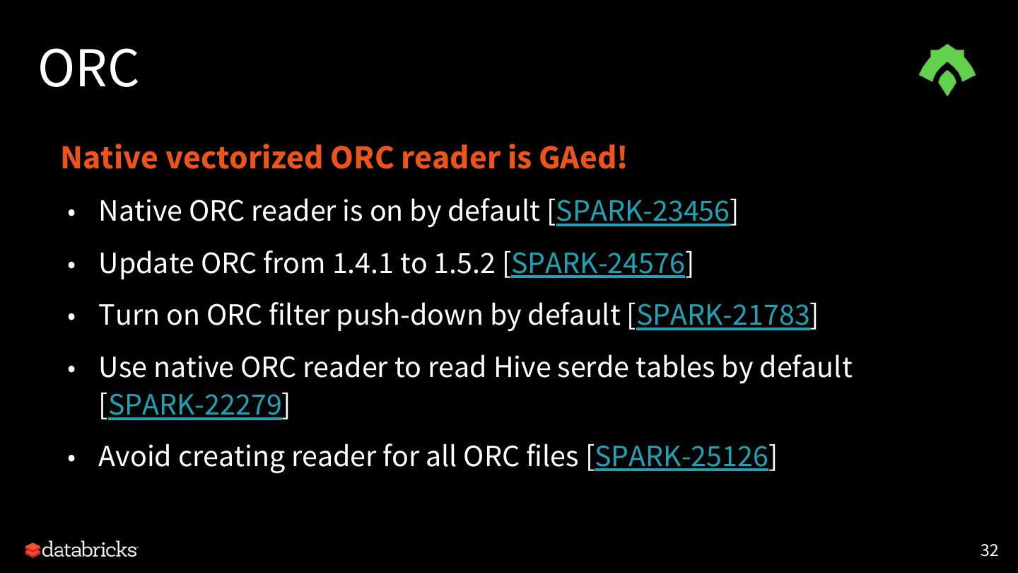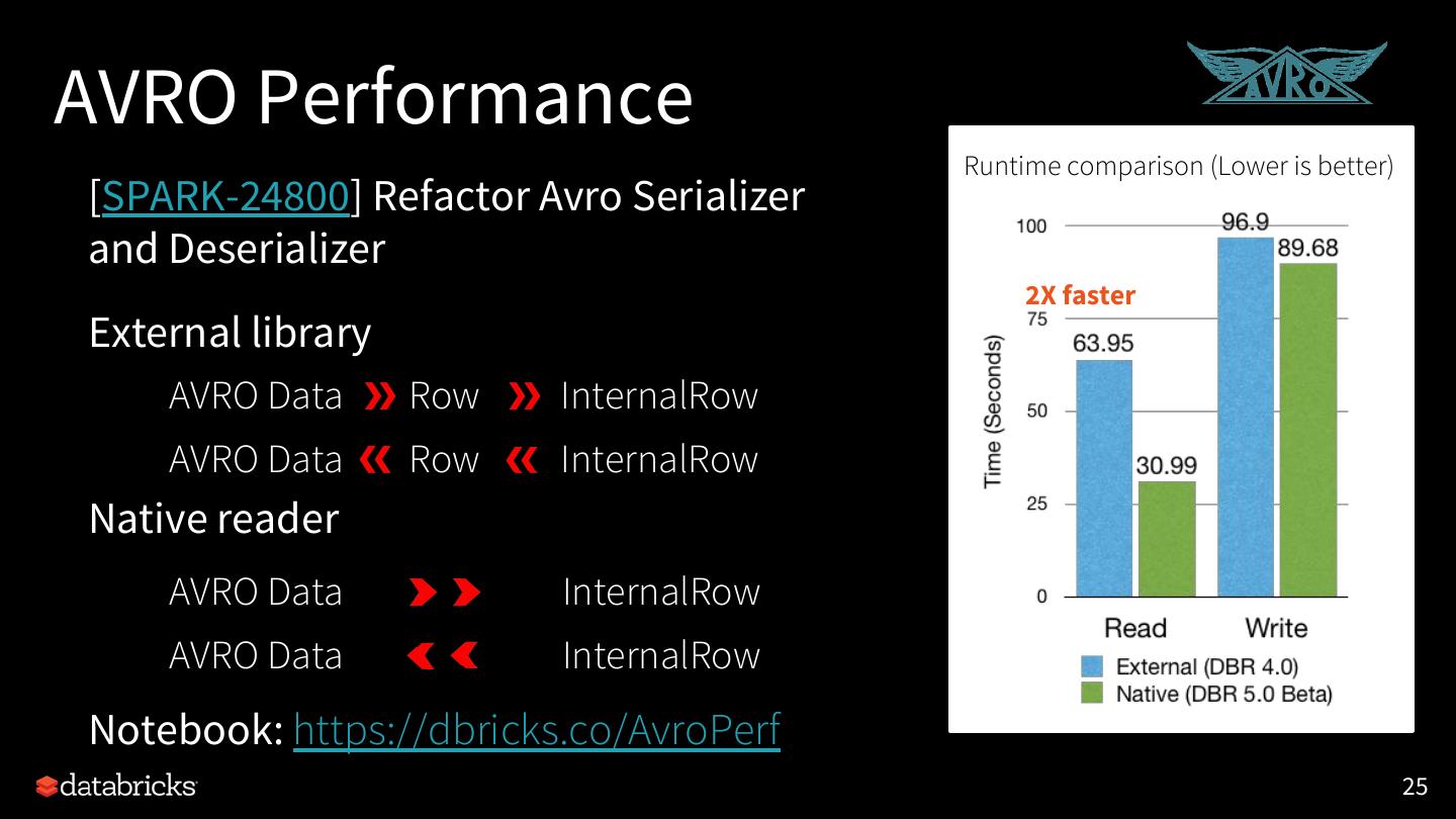 27 .AVRO Performance Runtime comparison (Lower is better) [SPARK-24800] Refactor Avro Serializer and Deserializer 2X faster External library AVRO Data Row InternalRow AVRO Data Row InternalRow Native reader AVRO Data InternalRow AVRO Data InternalRow Notebook: https://dbricks.co/AvroPerf 25