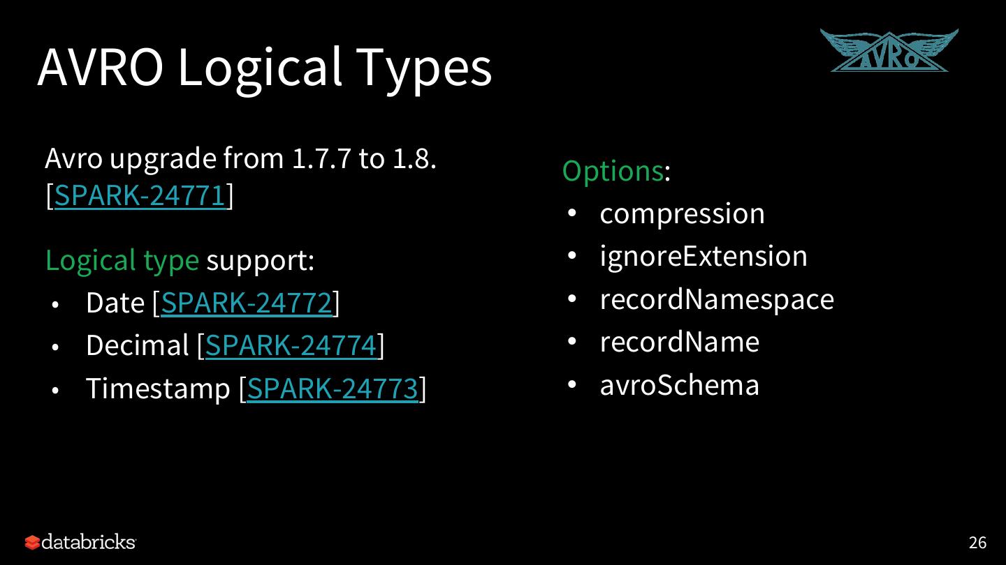 25 .AVRO • Apache Avro (https://avro.apache.org) • A data serialization format • Widely used in the Spark and Hadoop ecosystem, especially for Kafka-based data pipelines. • Spark-Avro package (https://github.com/databricks/spark-avro) • Spark SQL can read and write the avro data. • Inlining Spark-Avro package [SPARK-24768] • Better experience for first-time users of Spark SQL and structured streaming • Expect further improve the adoption of structured streaming 23