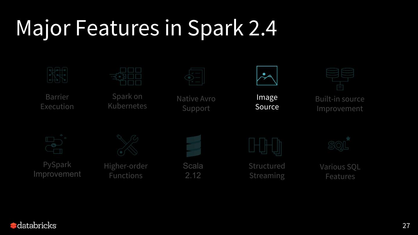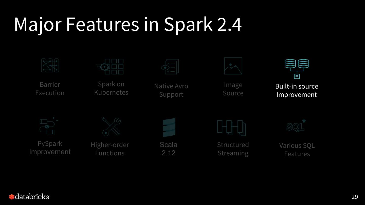 29 .Major Features in Spark 2.4 Barrier Spark on Native Avro Image Built-in source Execution Kubernetes Support Source Improvement PySpark Higher-order Scala Structured Various SQL Improvement Functions 2.12 Streaming Features 27