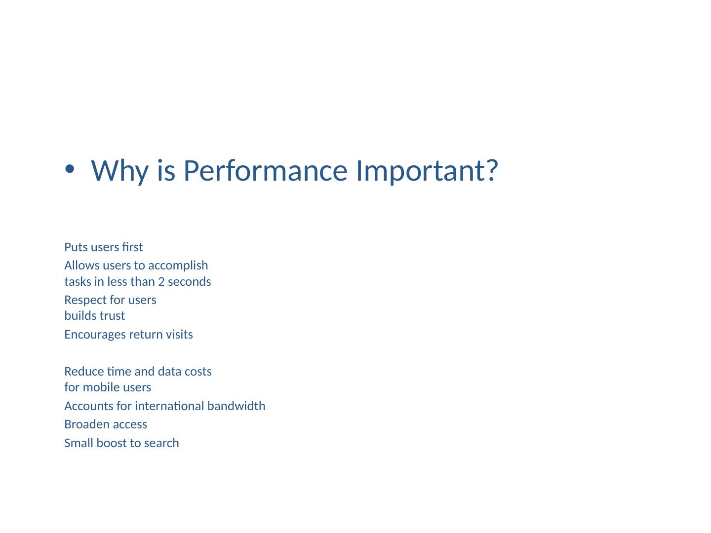 5 .Why is Performance Important ? Puts users first Allows users to accomplish tasks in less than 2 seconds Respect for users builds trust Encourages return visits Reduce time and data costs for mobile users Accounts for international bandwidth Broaden access Small boost to search