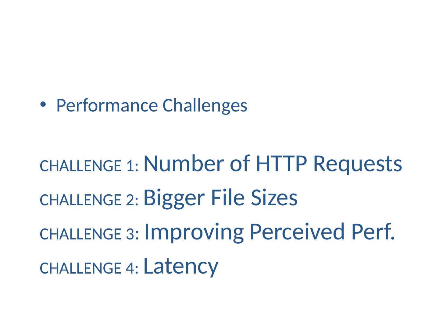 7 .Performance Challenges CHALLENGE 1: Number of HTTP Requests CHALLENGE 2 : Bigger File Sizes CHALLENGE 3 : Improving Perceived Perf . CHALLENGE 4: Latency