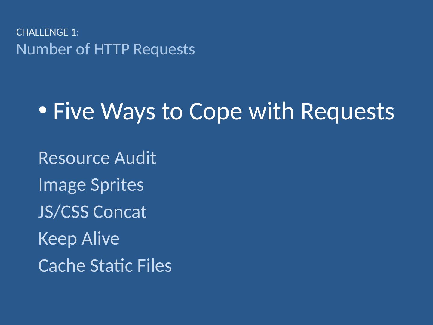 12 .Five Ways to Cope with Requests Resource Audit Image Sprites JS/CSS Concat Keep Alive Cache Static Files CHALLENGE 1 : Number of HTTP Requests