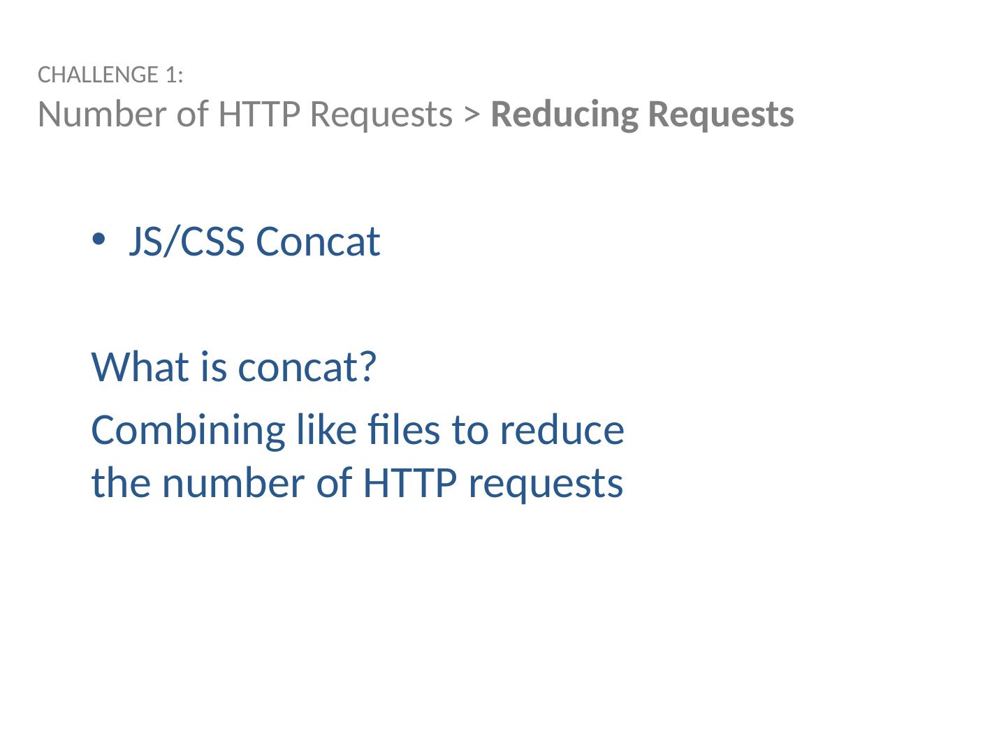 17 .CHALLENGE 1: Number of HTTP Requests > Reducing Requests JS/CSS Concat What is concat ? Combining like files to reduce the number of HTTP requests