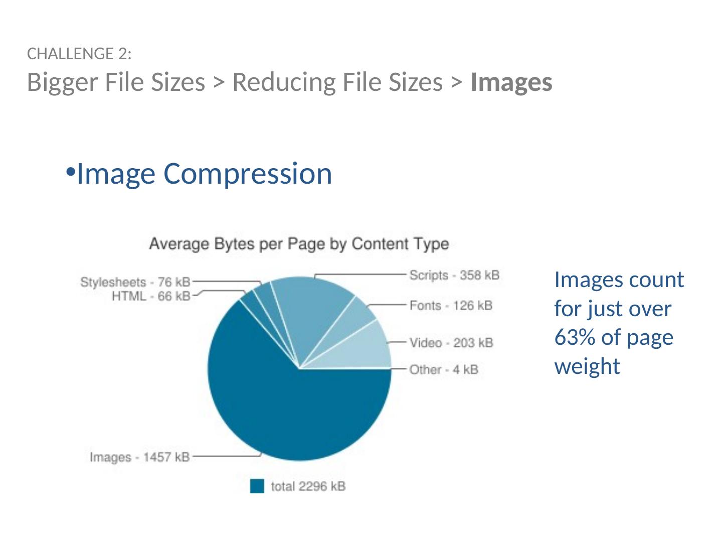 24 .Image Compression Images count for just over 63% of page weight CHALLENGE 2: Bigger File Sizes > Reducing File Sizes > Images