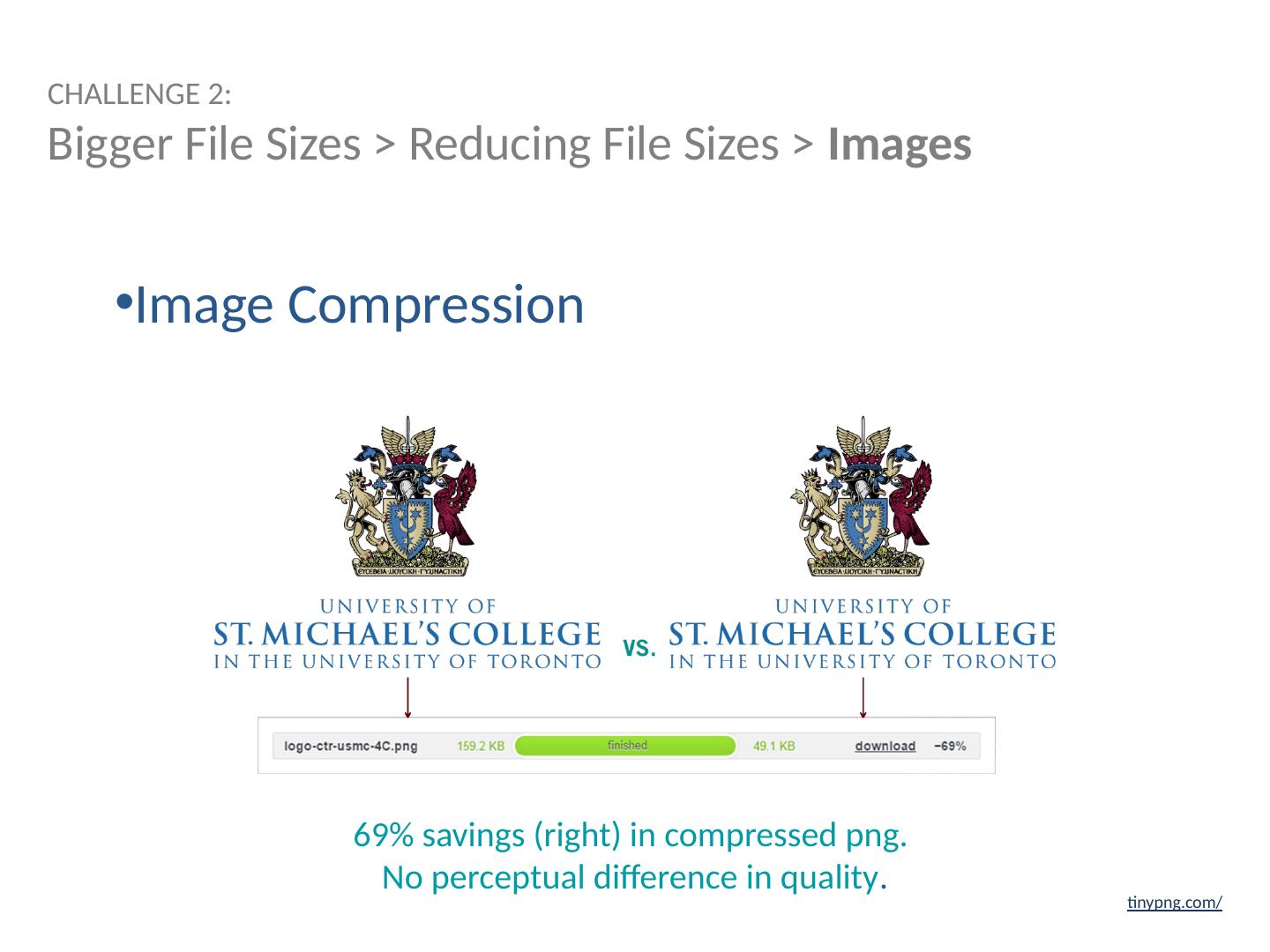 28 .Image Compression CHALLENGE 2: Bigger File Sizes > Reducing File Sizes > Images 69% savings (right) in compressed png. No perceptual difference in quality . tinypng.com /