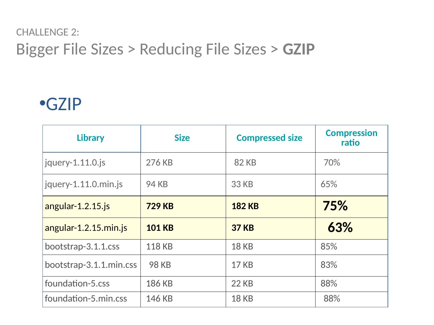 23 .Three Ways to Reduce File Sizes Images Right Size Right Format Compression Minification Gzip CHALLENGE 2: Bigger File Sizes