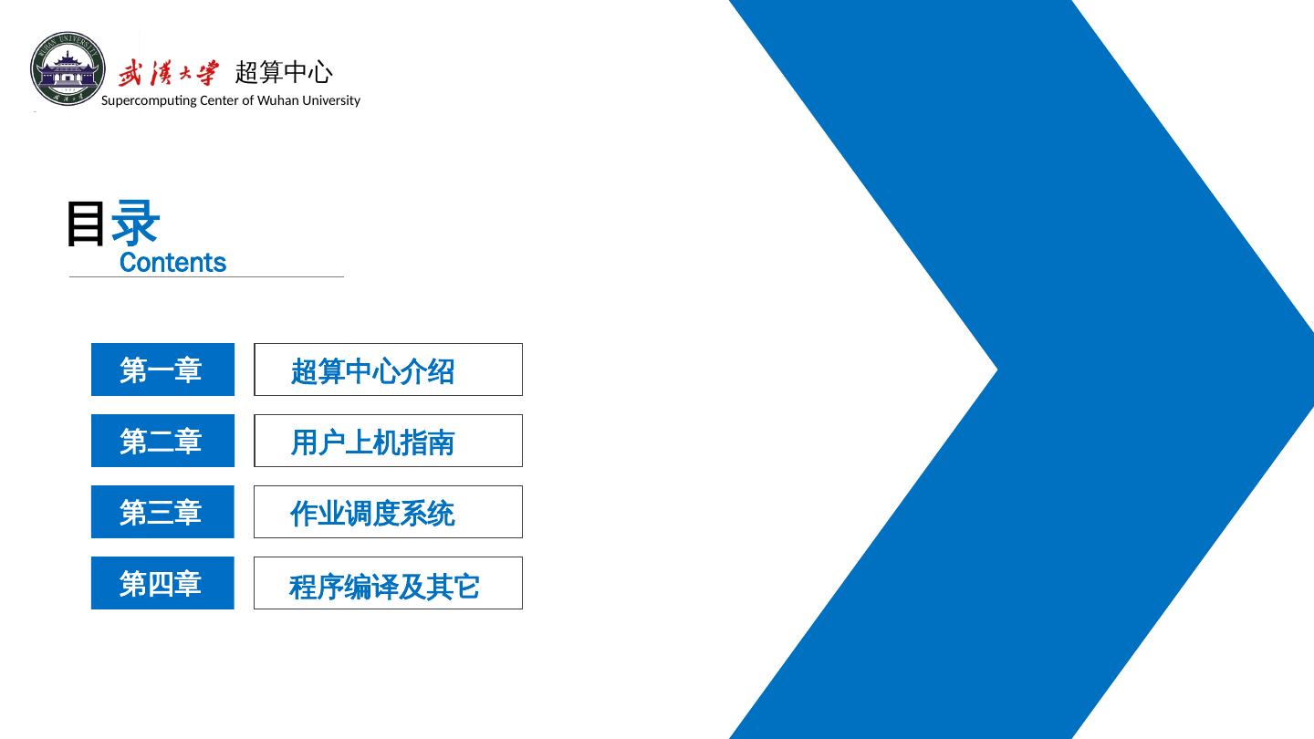 2 .超算中心介绍 第一章 用户上机指南 第二章 程序编 译 及其它 第三章 作业调度系统 第四章 目 录 Contents