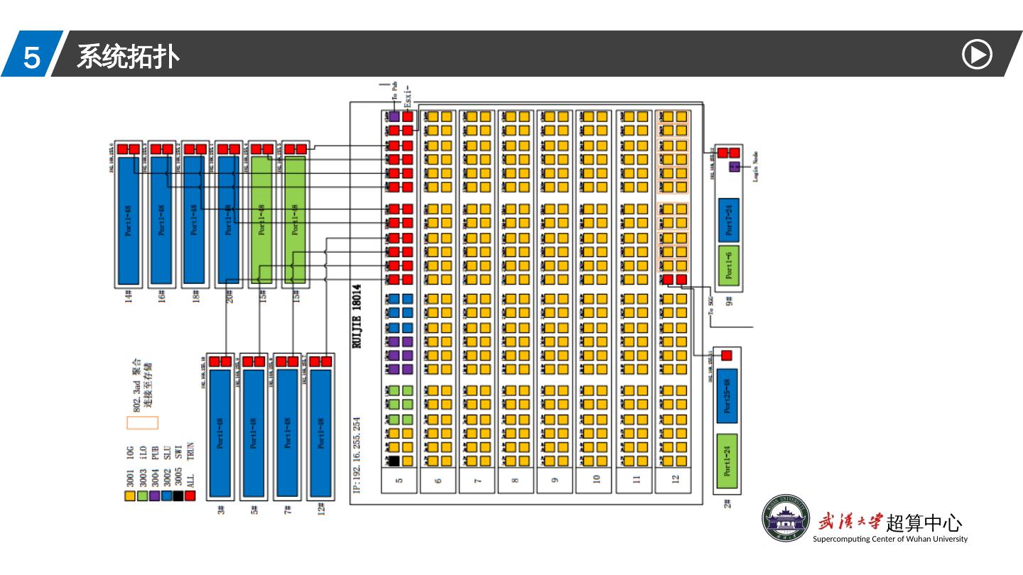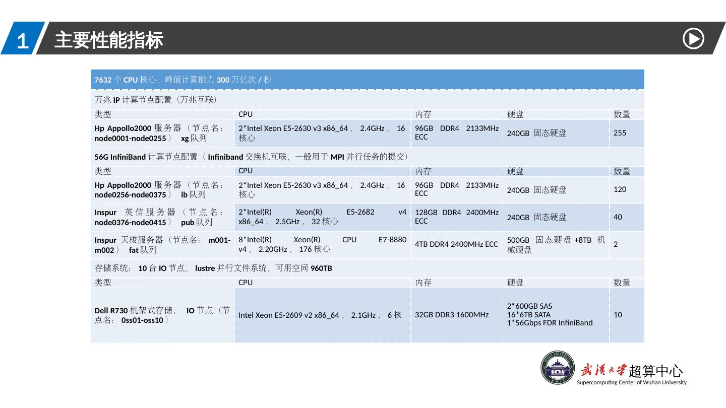 4 .1 主要性能指标 7632 个 CPU 核心,峰值计算能力 300 万亿次 / 秒 万兆 IP 计 算节点配置(万兆互联) 类型 CPU 内存 硬盘 数量 Hp Appollo2000 服务器(节点名: node0001-node0255 ) xg 队列 2*Intel Xeon E5-2630 v3 x86_64 , 2.4GHz , 16 核心 96GB DDR4 2133MHz ECC 240GB 固态硬盘 255 56G InfiniBand 计 算节点配置( Infiniband 交换机互联,一般用于 MPI 并行任务的提交) 类型 CPU 内存 硬盘 数量 Hp Appollo2000 服务器(节点名: node0256-node0375 ) ib 队列 2*Intel Xeon E5-2630 v3 x86_64 , 2.4GHz , 16 核心 96GB DDR4 2133MHz ECC 240GB 固态硬盘 120 Inspur 英信服务器(节点名: node0376-node0415 ) pub 队列 2*Intel(R) Xeon(R) E5-2682 v4 x86_64 , 2.5GHz , 32 核心 128GB DDR4 2400MHz ECC 240GB 固态硬盘 40 Inspur 天梭服务器(节点名: m001-m002 ) fat 队列 8*Intel(R) Xeon(R) CPU E7-8880 v4 , 2.20GHz , 176 核心 4TB DDR4 2400MHz ECC 500GB 固态硬盘 +8TB 机械硬盘 2 存储系统: 10 台 IO 节点, lustre 并行文件系统,可用空间 960TB 类型 CPU 内存 硬盘 数量 Dell R730 机架式存储, IO 节点(节点名: 0ss01-oss10 ) Intel Xeon E5-2609 v2 x86_64 , 2.1GHz , 6 核 32GB DDR3 1600MHz 2*600GB SAS 16*6TB SATA 1*56Gbps FDR InfiniBand 10