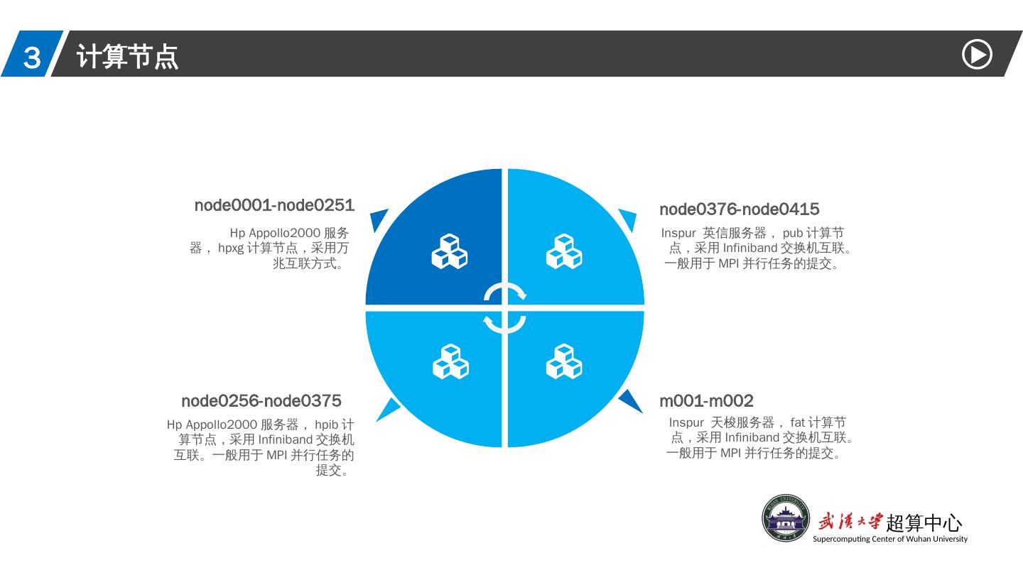 6 .3 计算节点 node0001-node0251 Hp Appollo2000 服务器 , hpxg 计算节点,采用万兆互联方式。 node0376-node0415 Inspur 英信服务器 , pub 计算节点,采用 Infiniband 交换机互联 。 一般用于 MPI 并行任务的提交 。 node0256-node0375 Hp Appollo2000 服务器 , hpib 计算节点,采用 Infiniband 交换机互联 。 一般用于 MPI 并行任务的提交 。 m001-m002 Inspur 天梭 服务器 , fat 计算节点,采用 Infiniband 交换机互联 。 一般用于 MPI 并行任务的提交 。