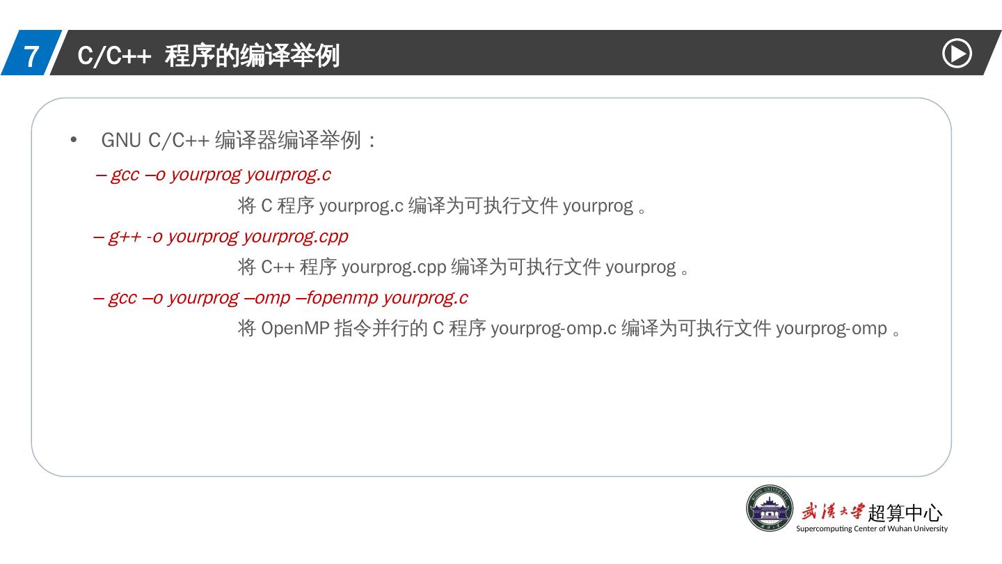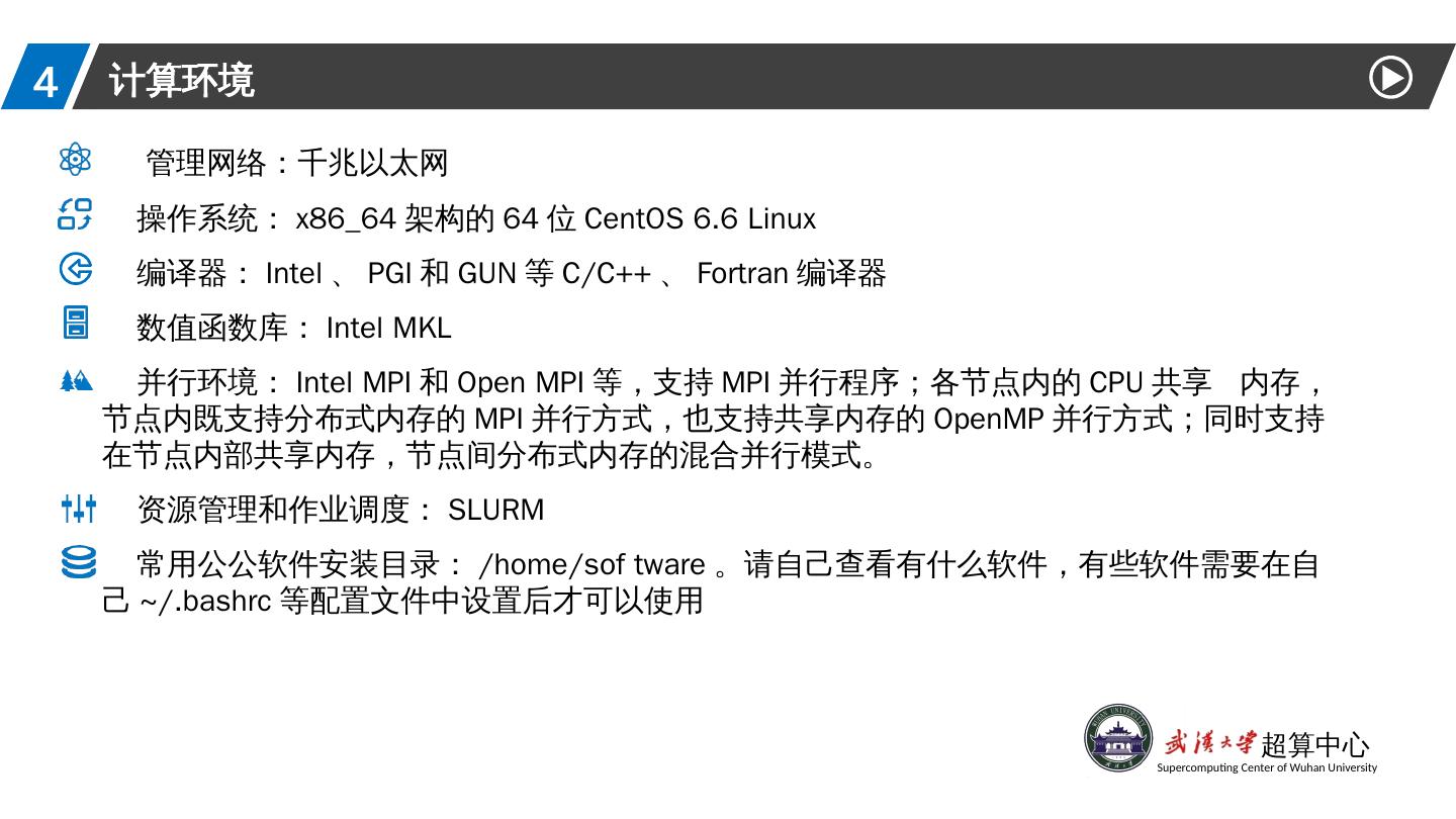 7 .4 计算环境 管理网络:千兆以太网 操作系统: x86_64 架构的 64 位 CentOS 6.6 Linux 编译器: Intel 、 PGI 和 GUN 等 C/C++ 、 Fortran 编译器 数值函数库: Intel MKL 并行环境: Intel MPI 和 Open MPI 等,支持 MPI 并行程序;各节点内的 CPU 共享 内存,节点内既支持分布式内存的 MPI 并行方式,也支持共享内存的 OpenMP 并行方式;同时支持在节点内部共享内存,节点间分布式内存的混合并行模式。 资源管理和作业调度: SLURM 常用公公软件安装目录: /home/ sof tware 。请自己查看有什么软件,有些软件需要在自己 ~/. bashrc 等配置文件中设置后才可以使用