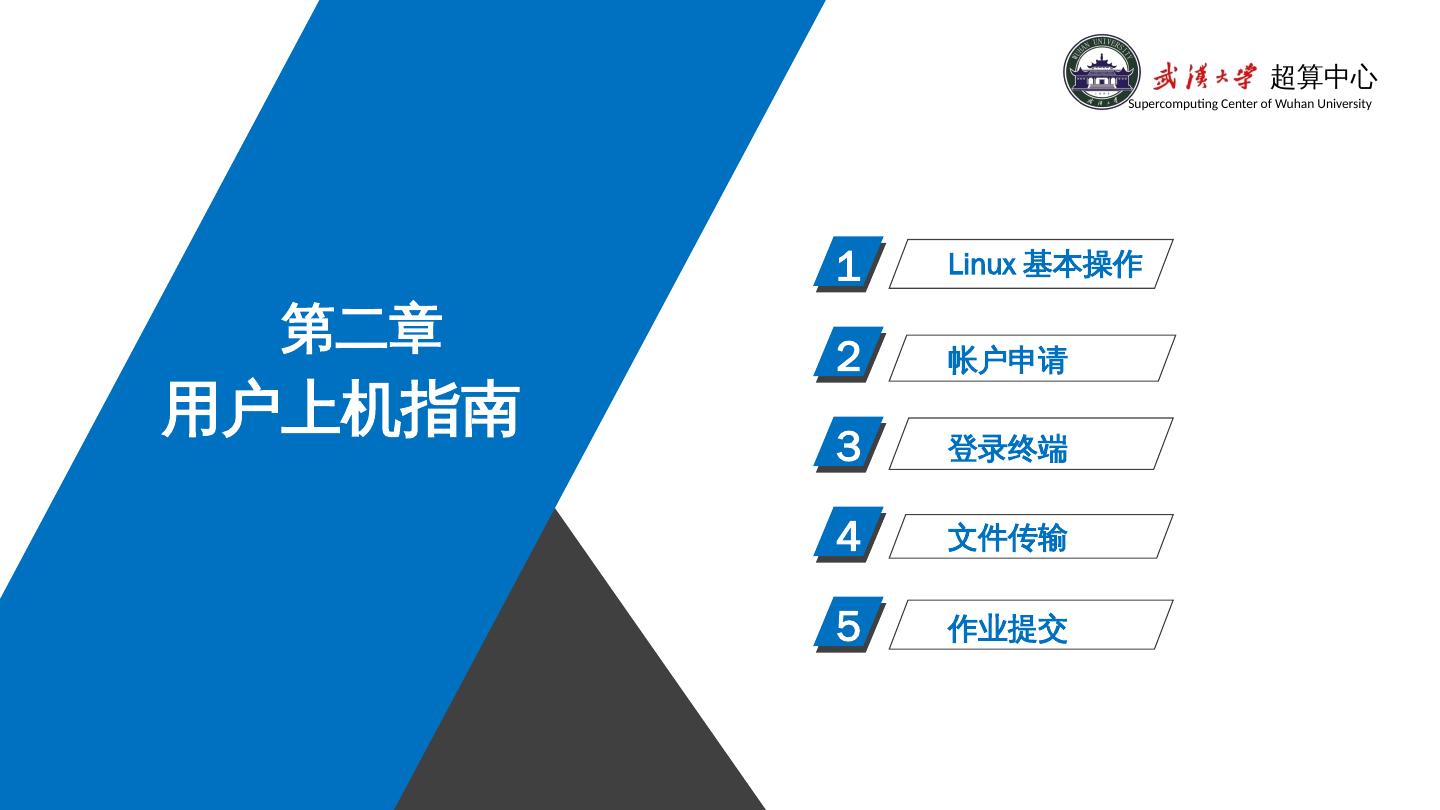 9 .第二章 用户上机指南 2 3 4 5 1 帐户申请 登录终端 文件传输 作业提交 Linux 基本操作