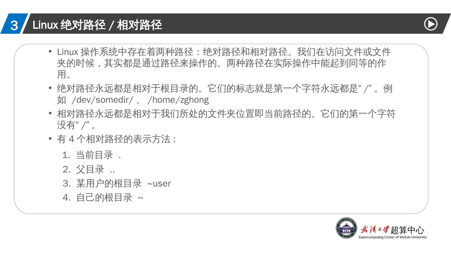 12 .3 Linux 绝对路径 / 相对路径 Linux 操作系统中存在着两种路径:绝对路径和相对路径。我们在访问文件或文件夹的时候,其实都是通过路径来操作的。两种路径在实际操作中能起到同等的作用。 绝对路径永远都是相对 于 根目录 的 。它们的标志就是第一个字符永远都是“ /” 。 例如 /dev/ somedir / 、 /home/ zghong 相对 路径永远都是相对于我们所处的 文件夹位置即当前路径的。 它们的第一个字符没有“ /” 。 有 4 个相对路径的表示方法 : 1. 当前 目录 . 2. 父目录 .. 3. 某 用户的根目录 ~user 4. 自己 的根目录 ~