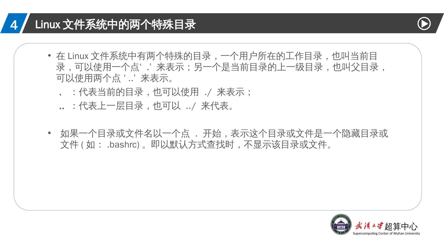 13 .4 Linux 文件系统中的两个特殊目录 在 Linux 文件系统中有两个特殊的目录,一个用户所在的工作目录,也叫当前目录,可以使用一个 点‘ . ’ 来表示;另一个是当前目录的上一级目录,也叫父目录,可以使用两个点 ‘ .. ’ 来表示 。 . : 代表当前的目录,也可以使用 ./ 来表示; .. :代表 上一层目录,也可以 ../ 来代表 。 如果一个目录或文件名以一个点 . 开始,表示这个目录或文件是一个隐藏目录或文件 ( 如: . bashrc ) 。即以默认方式查找时,不显示该目录或文件。