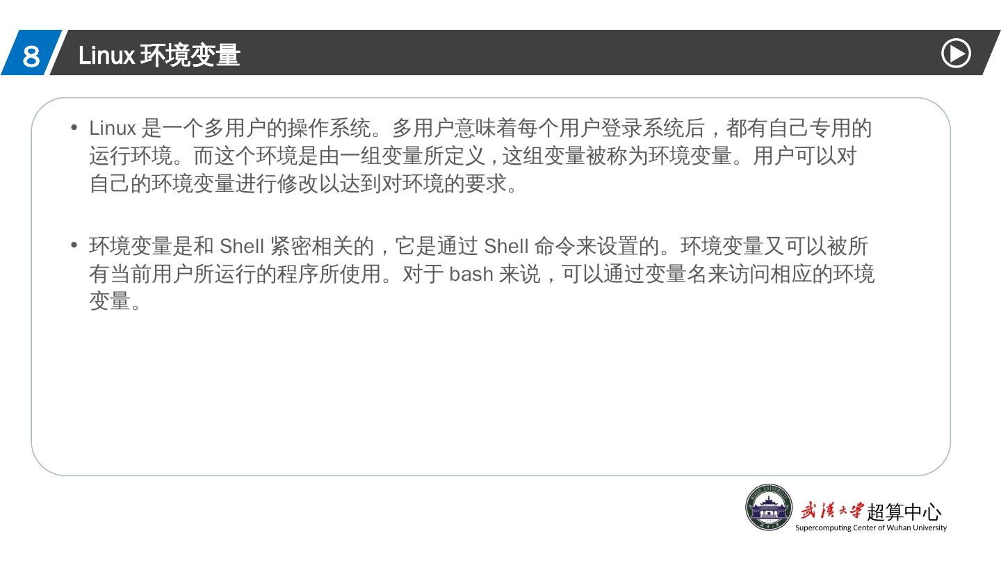 17 .8 Linux 环境变量 Linux 是一个多用户的操作系统。多用户意味着每个用户登录系统后,都有自己专用的运行环境。而这个环境是由一组变量所定义 , 这组变量被称为环境变量。用户可以对自己的环境变量进行修改以达到对环境的要求。 环境 变量是和 Shell 紧密相关的,它是通过 Shell 命令来设置的。环境变量又可以被所有当前用户所运行的程序所使用。对于 bash 来说,可以通过变量名来访问相应的环境变量。
