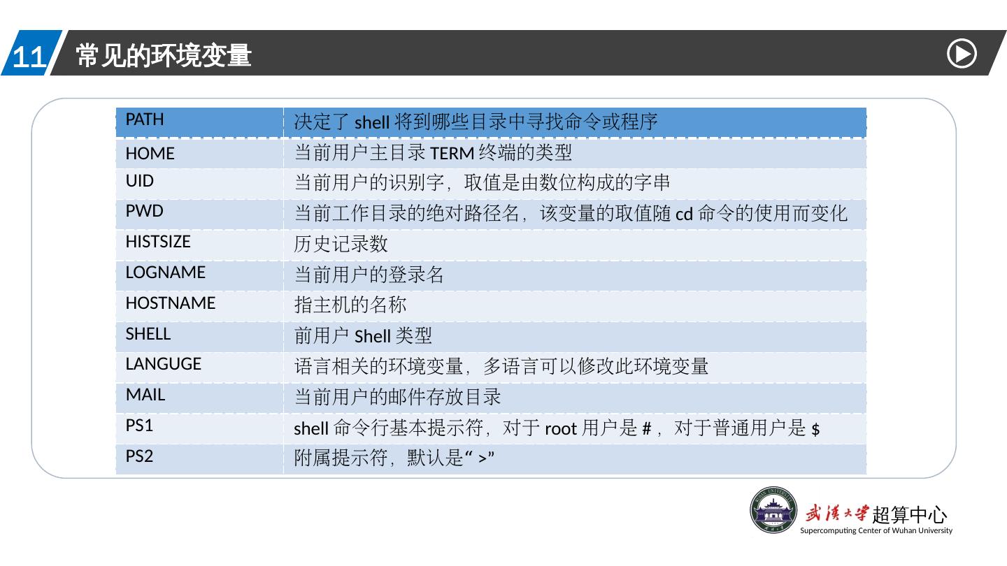 20 .11 常见的环境变量 PATH 决定了 shell 将到哪些目录中寻找命令或程序 HOME 当前用户主目录 TERM 终端的类型 UID 当前用户的识别字,取值是由数位构成的字串 PWD 当前工作目录的绝对路径名,该变量的取值随 cd 命令的使用而变化 HISTSIZE 历史记录数 LOGNAME 当前用户的登录名 HOSTNAME 指主机的名称 SHELL 前用户 Shell 类型 LANGUGE 语言相关的环境变量,多语言可以修改此环境变量 MAIL 当前用户的邮件存放目录 PS1 shell 命令行基本提示符,对于 root 用户是 # ,对于普通用户是 $ PS2 附属提示符,默认是“ >”