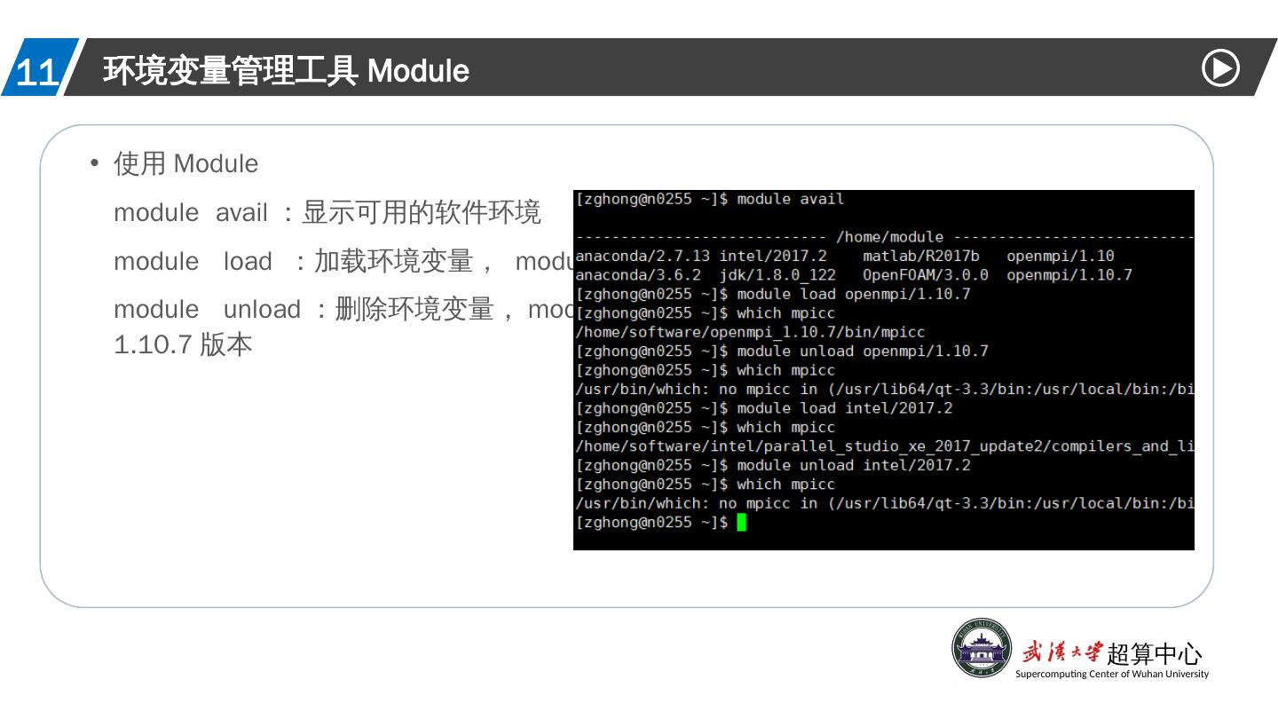21 .11 环境变量管理工具 Module 使用 Module module avail :显示可用的软件环境 module load :加载环境变量, module openmpi/1.10.7 加载 openmpi 1.10.7 版本 module unload :删除环境变量, module unload openmpi/1.10.7 删除 openmpi 1.10.7 版本