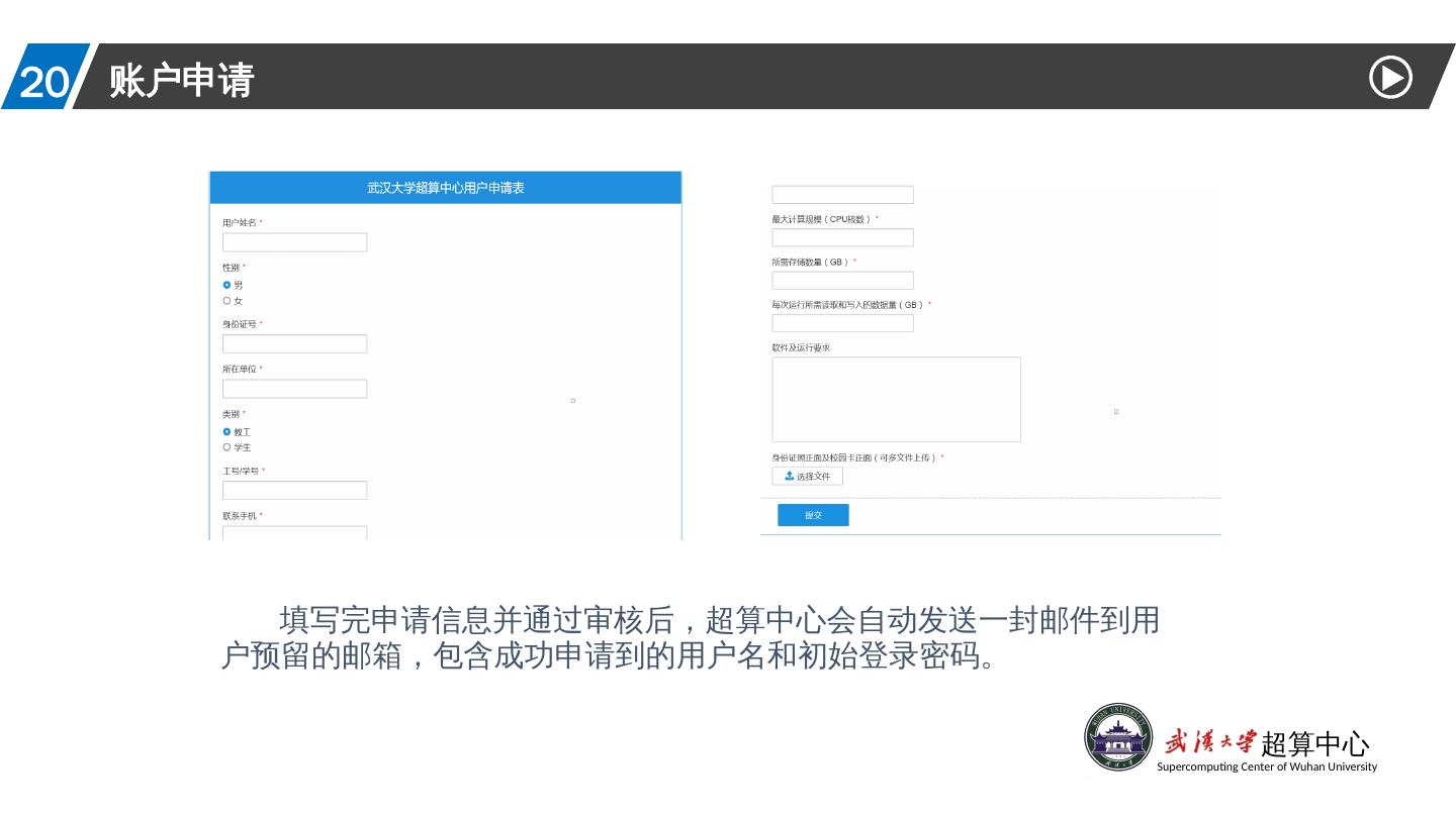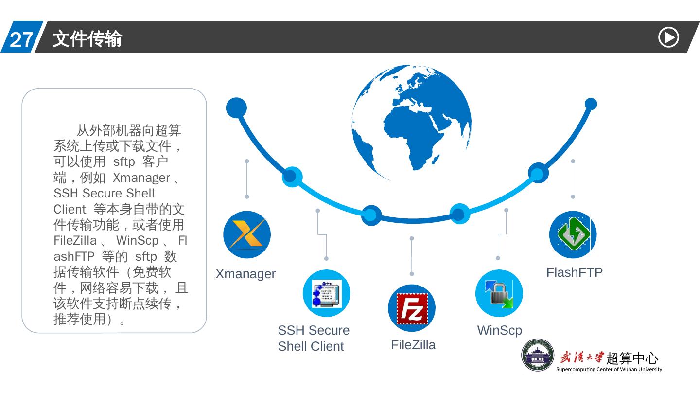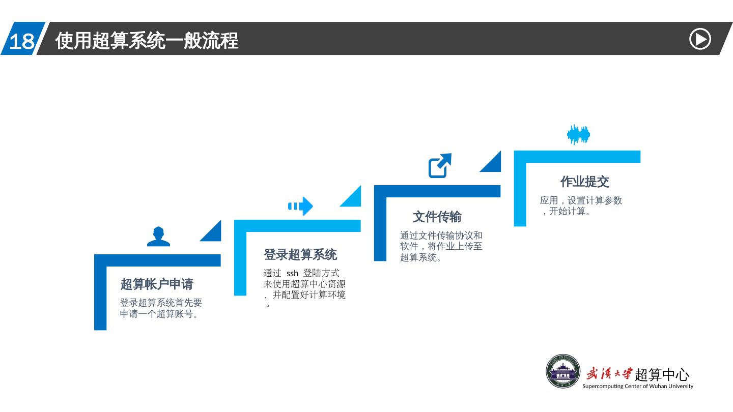 28 .18 使用超算系统一般流程 超 算帐户申请 登录超算系统首先要申请一个超算账号。 登录超算系统 通过 ssh 登陆方式来使用超算中心 资源,并配置好计算环境。 文件传输 通过文件传输协议和软件,将作业上传至超算系统。 作业提交 应用,设置计算参数,开始 计算。