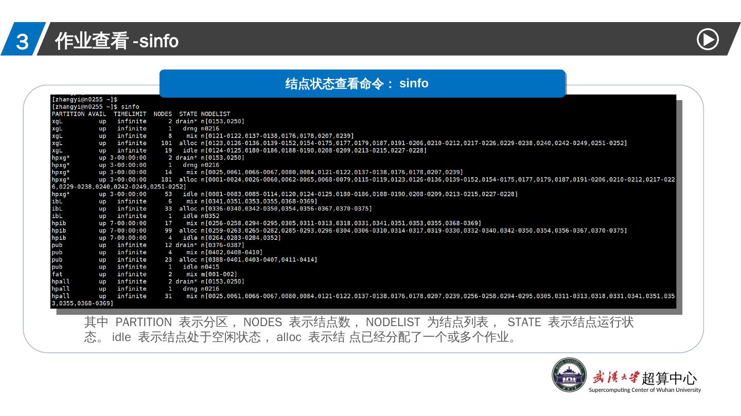 5 .2 超算节点 01 02 03 管理节点 节点名为 deploy , 用户无权登录 登录节点 节点名为 n0255 ,用户主登录节点,可以进行编译与通过作业调度系统提交作业。禁止直接在此节点上运行作业。 计算节点 节点名: n0001-n0251, n0253-n0254,n0256,m001-m002 , 计算节点分为四个分区。