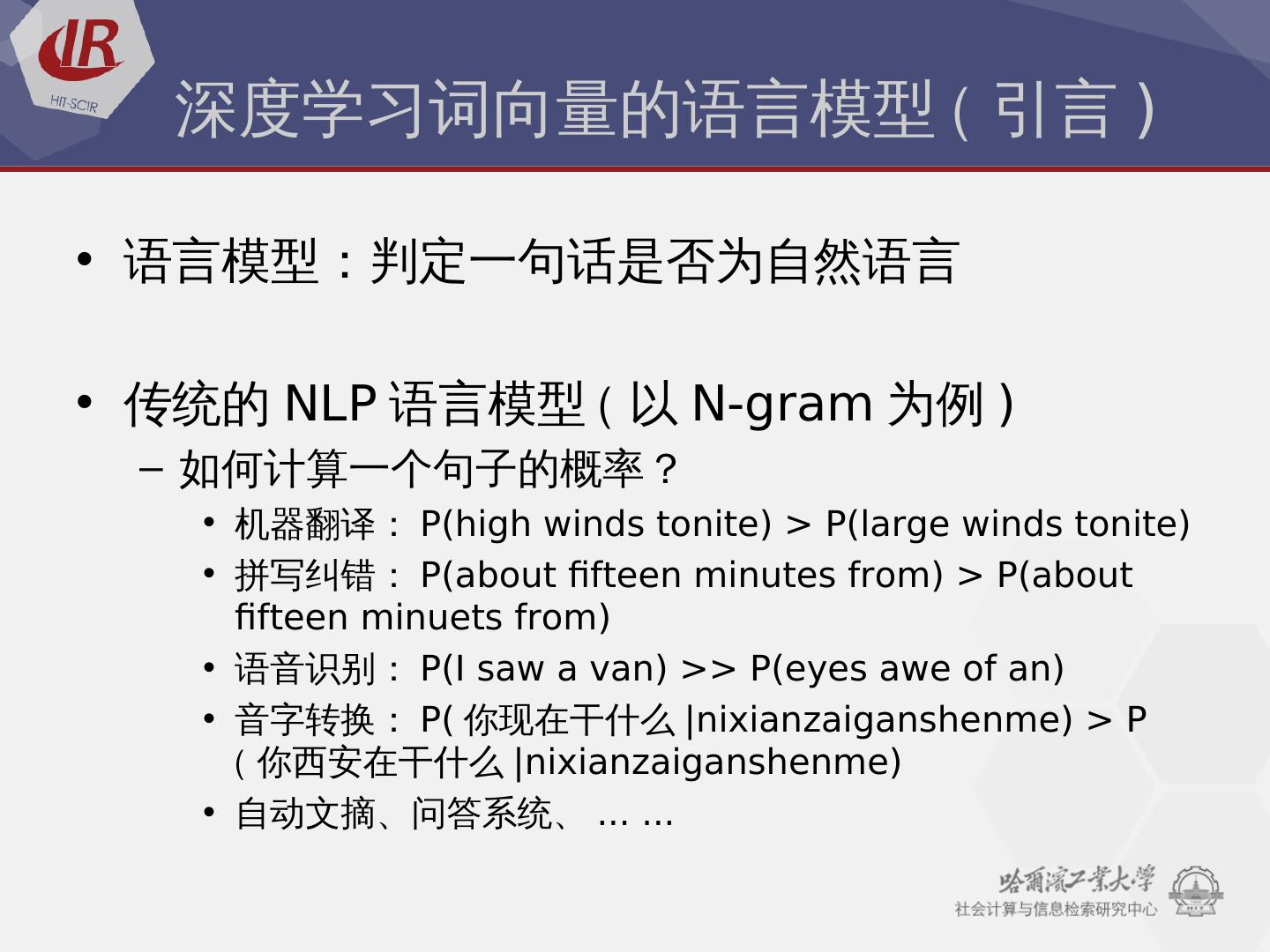 8 . 深度学习词向量的语言模型 ( 引言 ) • 语言模型:判定一句话是否为自然语言 • 传统的 NLP 语言模型 ( 以 N-gram 为例 ) – 如何计算一个句子的概率? • 机器翻译: P(Bengio 2003)high winds tonite) > P(Bengio 2003)large winds tonite) • 拼写纠错: P(Bengio 2003)about fifteen minutes from) > P(Bengio 2003)about fifteen minuets from) • 语音识别: P(Bengio 2003)I saw a van) >> P(Bengio 2003)eyes awe of an) • 音字转换: P(Bengio 2003) 你现在干什么 |nixianzaiganshenme) > Pnixianzaiganshenme) > P ( 你西安在干什么 |nixianzaiganshenme) > Pnixianzaiganshenme) • 自动文摘、问答系统、 ... ...