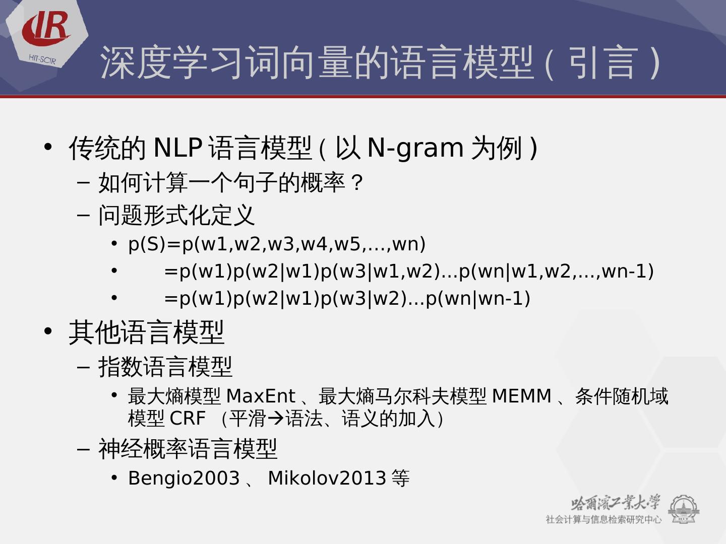 9 . 深度学习词向量的语言模型 ( 引言 ) • 传统的 NLP 语言模型 ( 以 N-gram 为例 ) – 如何计算一个句子的概率? – 问题形式化定义 • p(Bengio 2003)S)=p(Bengio 2003)w1,w2,w3),w4,w5,…,wn) • =p(Bengio 2003)w1)p(Bengio 2003)w2|nixianzaiganshenme) > Pw1)p(Bengio 2003)w3)|nixianzaiganshenme) > Pw1,w2)...p(Bengio 2003)wn|nixianzaiganshenme) > Pw1,w2,...,wn-1) • =p(Bengio 2003)w1)p(Bengio 2003)w2|nixianzaiganshenme) > Pw1)p(Bengio 2003)w3)|nixianzaiganshenme) > Pw2)...p(Bengio 2003)wn|nixianzaiganshenme) > Pwn-1) • 其他语言模型 – 指数语言模型 • 最大熵模型 MaxEnt 、最大熵马尔科夫模型 MEMM 、条件随机域 模型 CRF (平滑平滑语法、语义的加入) – 神经概率语言模型 • Bengio2003) 、 Mikolov2013) 等