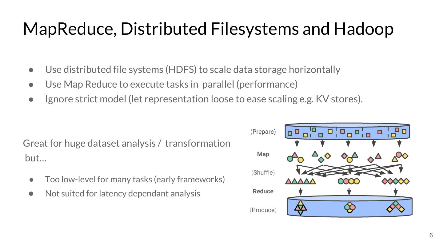 6 .MapReduce, Distributed Filesystems and Hadoop ● Use distributed file systems (HDFS) to scale data storage horizontally ● Use Map Reduce to execute tasks in parallel (performance) ● Ignore strict model (let representation loose to ease scaling e.g. KV stores). (Prepare) Great for huge dataset analysis / transformation Map but… (Shuffle) ● Too low-level for many tasks (early frameworks) Reduce ● Not suited for latency dependant analysis (Produce) 6
