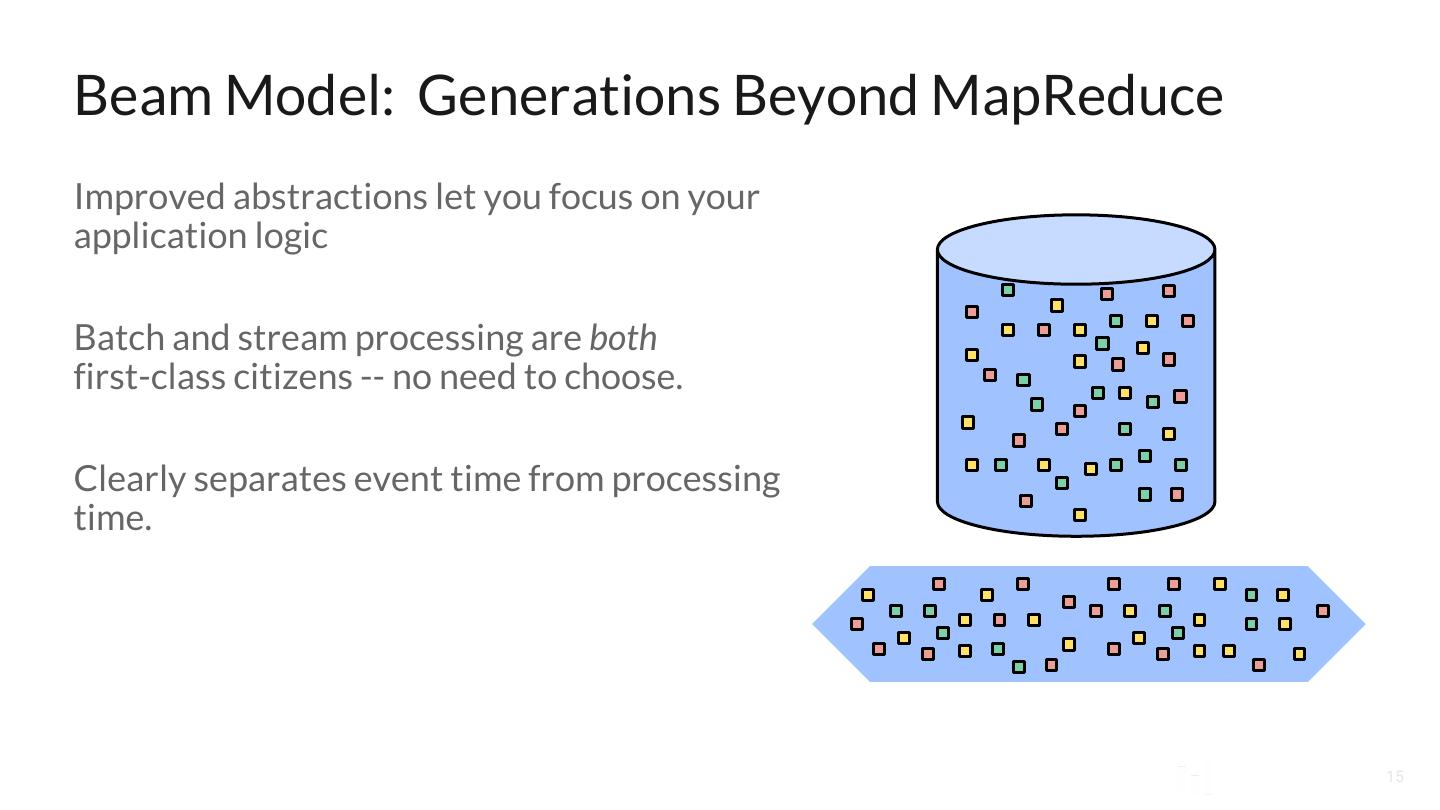 15 .Beam Model: Generations Beyond MapReduce Improved abstractions let you focus on your application logic Batch and stream processing are both first-class citizens -- no need to choose. Clearly separates event time from processing time. 15