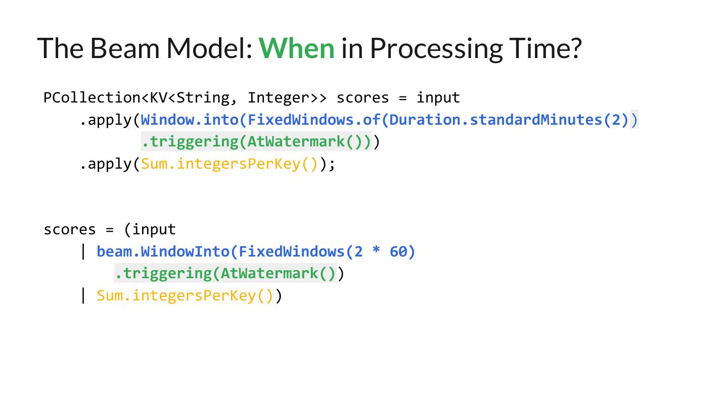 25 .The Beam Model: When in Processing Time? PCollection<KV<String, Integer>> scores = input .apply(Window.into(FixedWindows.of(Duration.standardMinutes(2)) .triggering(AtWatermark())) .apply(Sum.integersPerKey()); scores = (input | beam.WindowInto(FixedWindows(2 * 60) .triggering(AtWatermark()) | Sum.integersPerKey())
