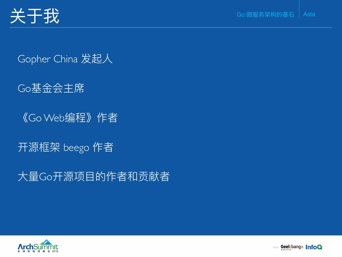 2 .关于我 Go:微服务架构的基⽯石 Asta Gopher China 发起⼈人 Go基⾦金金会主席 《Go Web编程》作者 开源框架 beego 作者 ⼤大量量Go开源项⽬目的作者和贡献者