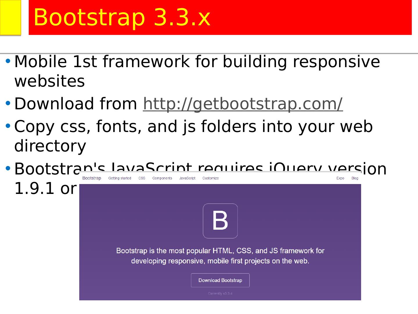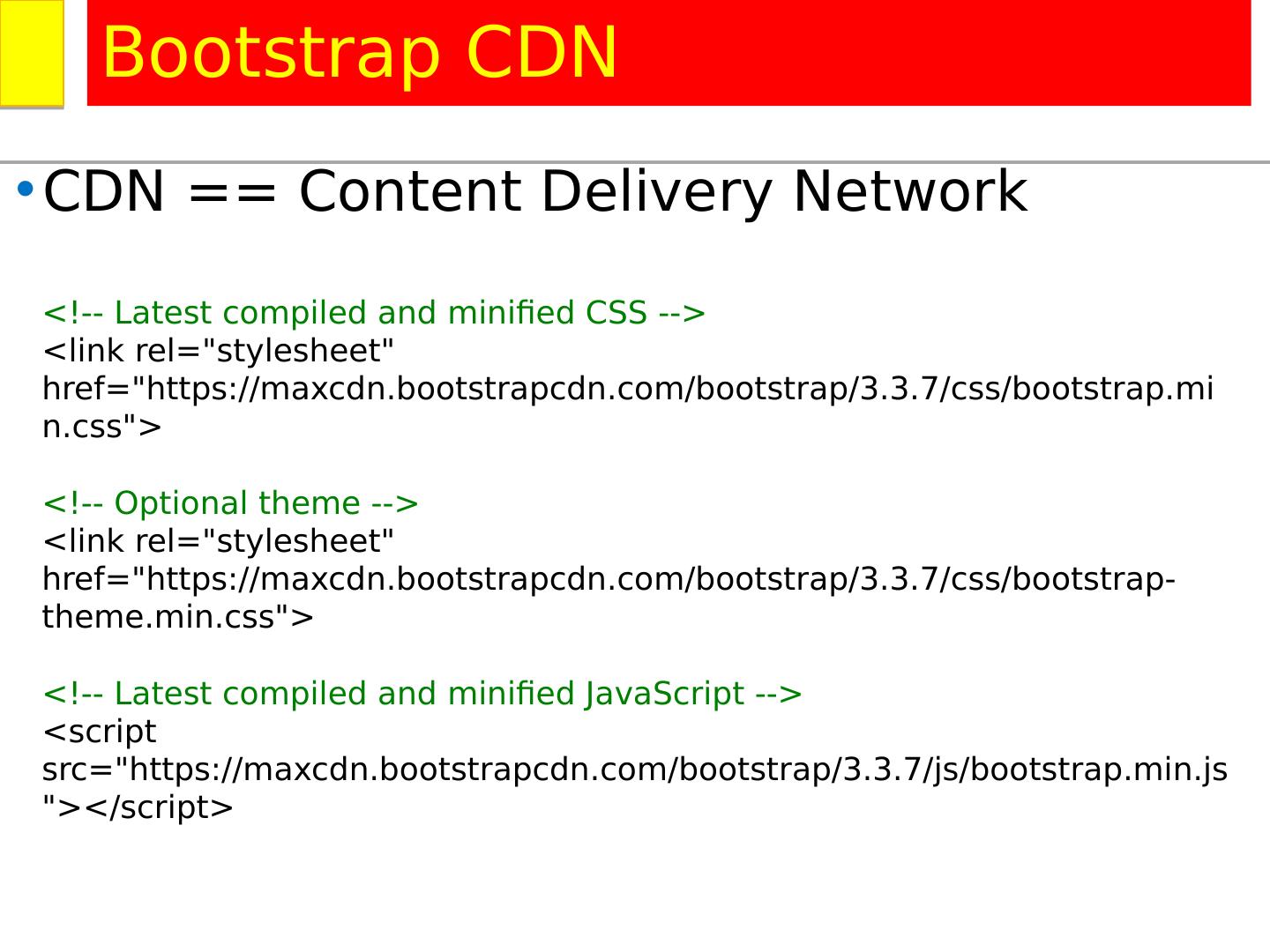 6 .CDN == Content Delivery Network Bootstrap CDN http://www.asp.net/ajax/cdn <!-- Latest compiled and minified CSS --> <link rel ="stylesheet" href ="https:// maxcdn.bootstrapcdn.com/bootstrap/3.3.7/ css /bootstrap.min.css "> <!-- Optional theme --> <link rel ="stylesheet" href ="https:// maxcdn.bootstrapcdn.com/bootstrap/3.3.7/ css /bootstrap-theme.min.css "> <!-- Latest compiled and minified JavaScript --> <script src ="https:// maxcdn.bootstrapcdn.com/bootstrap/3.3.7/ js /bootstrap.min.js "></script>