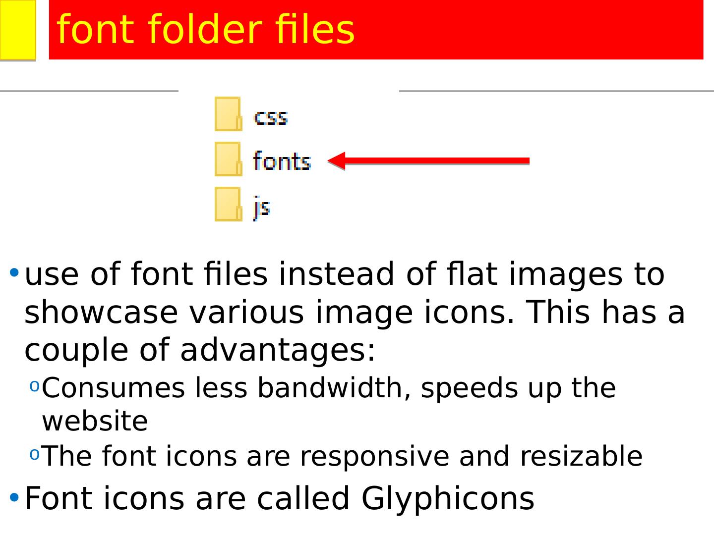 4 .use of font files instead of flat images to showcase various image icons. This has a couple of advantages: Consumes less bandwidth, speeds up the website The font icons are responsive and resizable Font icons are called Glyphicons font folder files