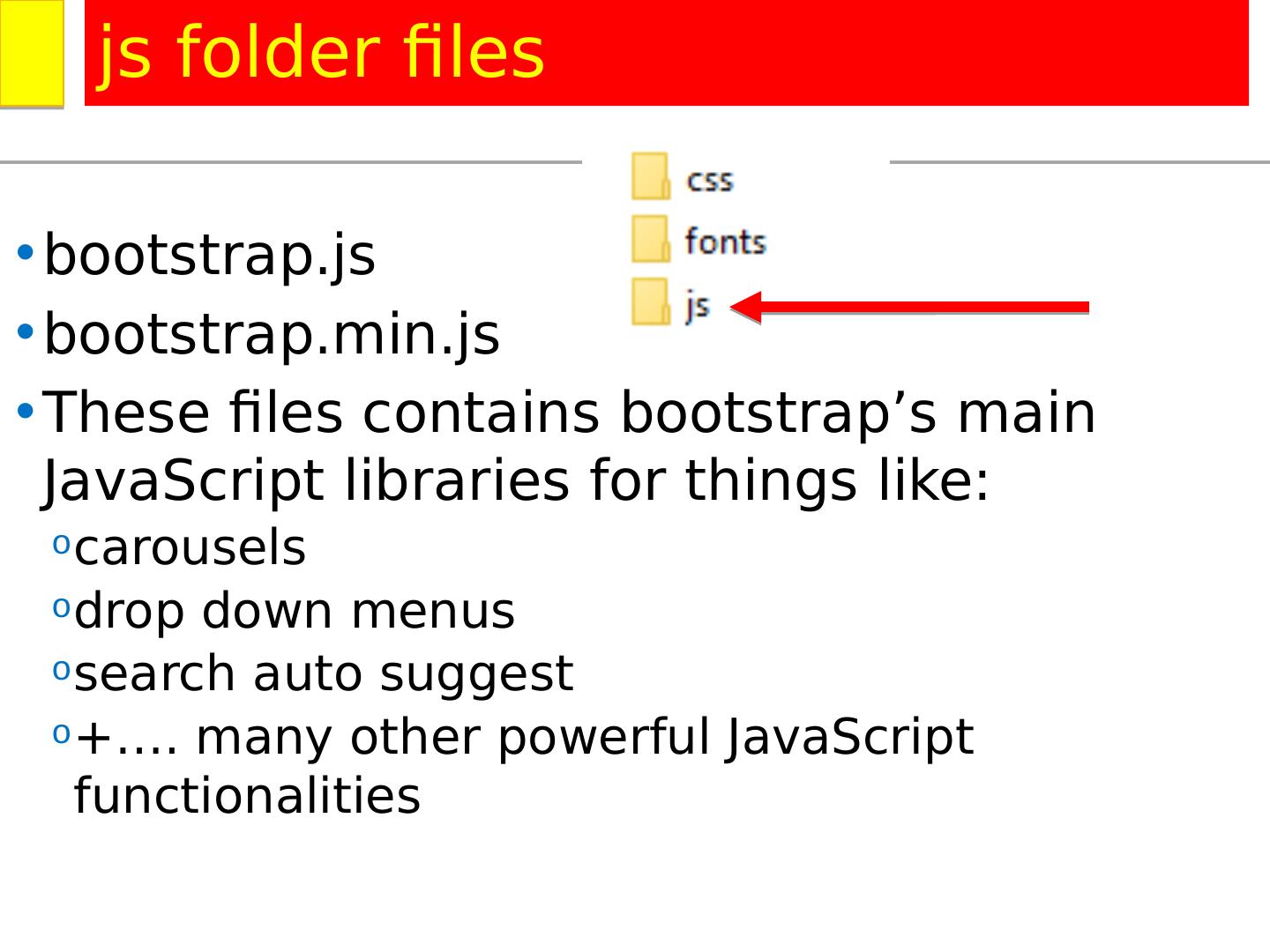 5 .bootstrap.js bootstrap.min.js These files contains bootstrap’s main JavaScript libraries for things like: carousels drop down menus search auto suggest +…. many other powerful JavaScript functionalities js folder files