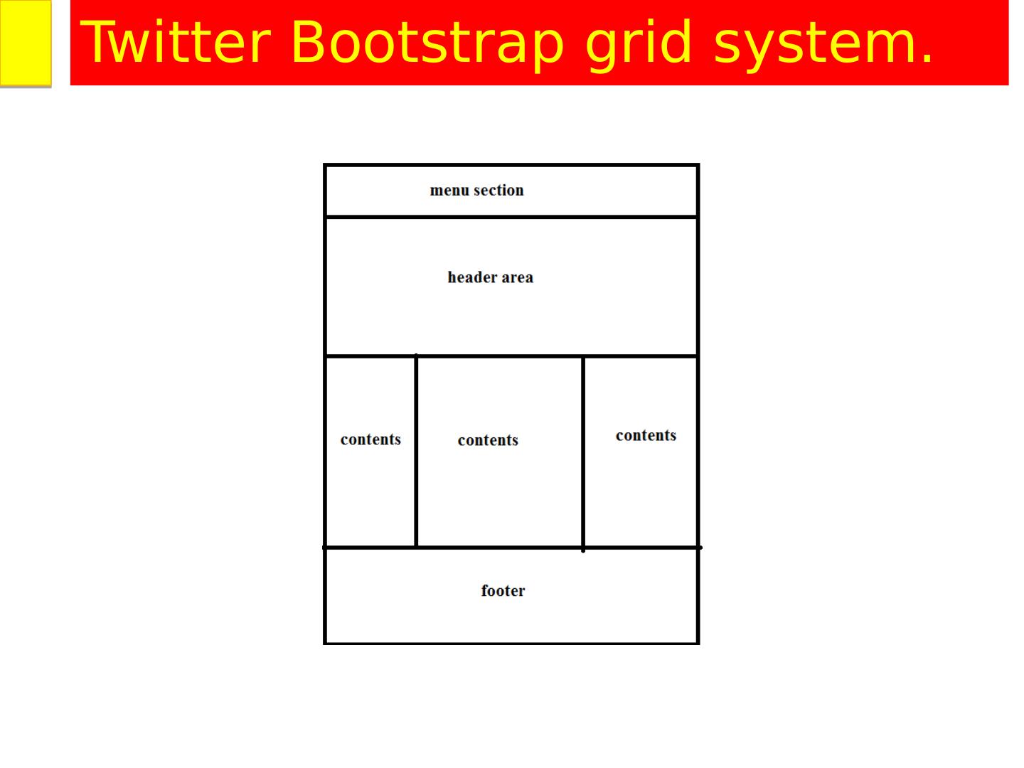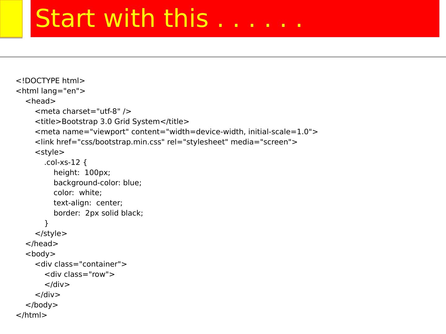 11 .<!DOCTYPE html> <html lang =" en "> <head> <meta charset="utf-8" /> <title>Bootstrap 3.0 Grid System</title> <meta name="viewport" content="width=device-width, initial-scale=1.0"> <link href =" css /bootstrap.min.css" rel =" stylesheet " media="screen"> <style> .col-xs-12 { height: 100px; background-color: blue; color: white; text-align: center; border: 2px solid black; } </style> </head> <body> <div class="container"> <div class="row"> </div> </div> </body> </html> Start with this . . . . . .